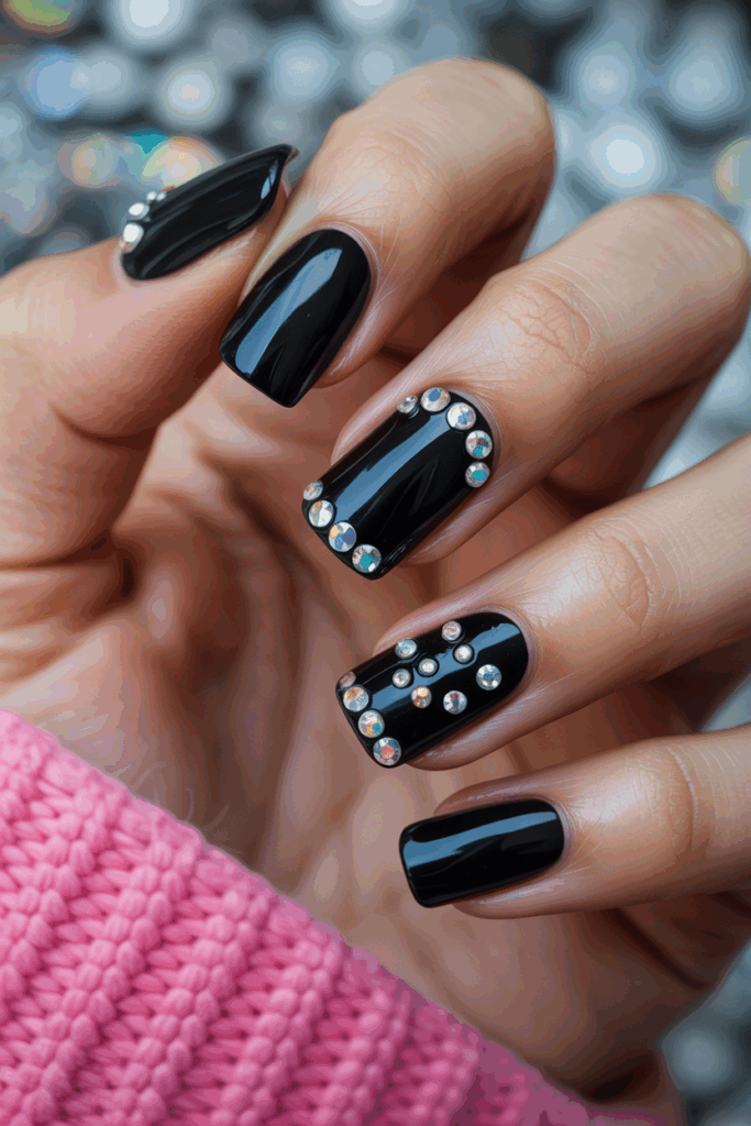 Black nails with rhinestone studs create a stylish and bold look. The studs add a touch of sparkle without overwhelming the dark base color.