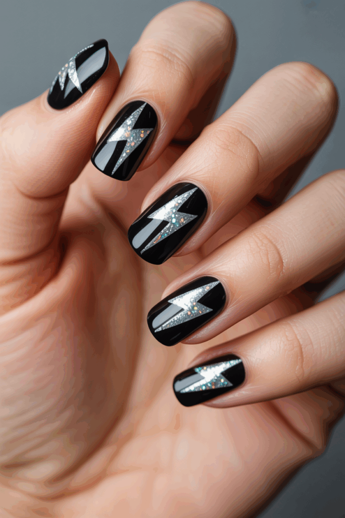 Black nails with silver lightning bolts create a bold, eye-catching look. The silver design stands out sharply against the dark background.