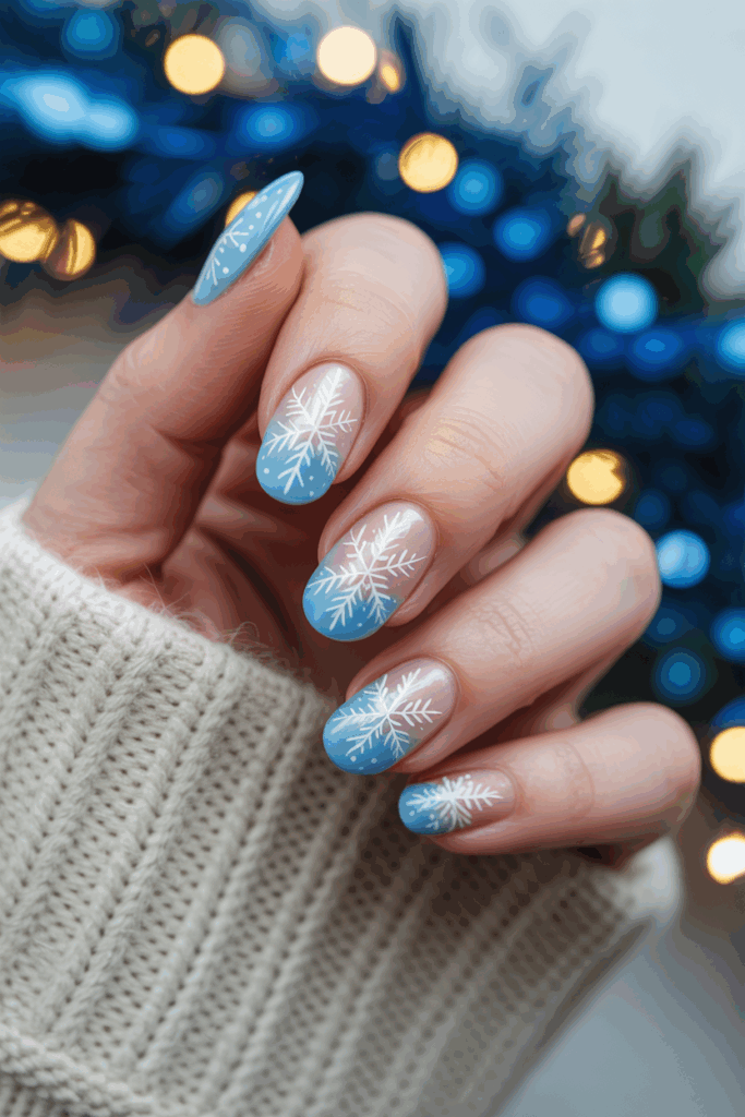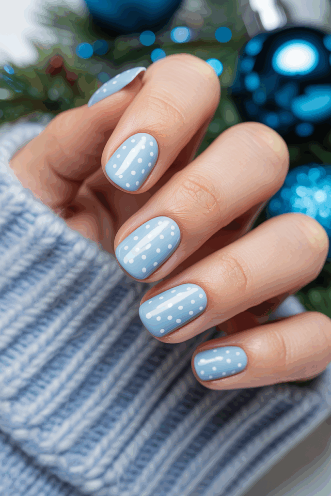 This design features a soft pastel blue base that feels calm and wintery. Small white dots are placed across the nails to mimic falling snow. It’s a simple look that fits well with any holiday style.