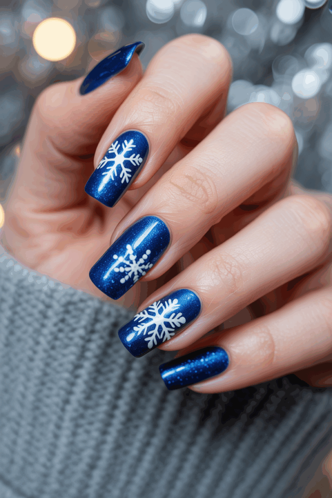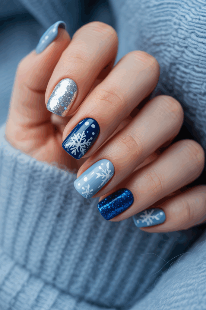 This design features blue nails decorated with glittery snowflakes. Silver accents add a subtle shine.