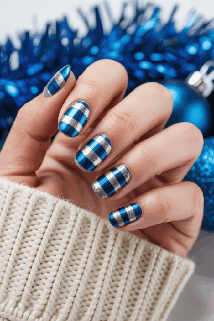 This design pairs a deep blue base with silver candy cane stripes for a modern holiday look.