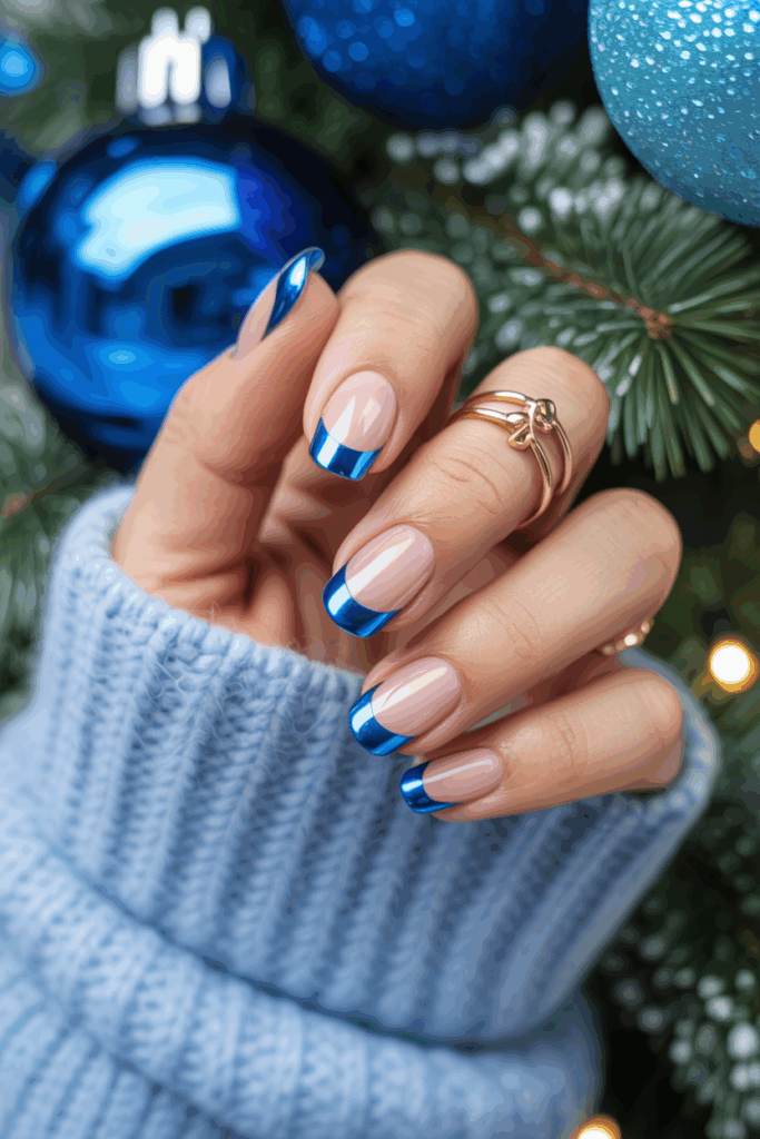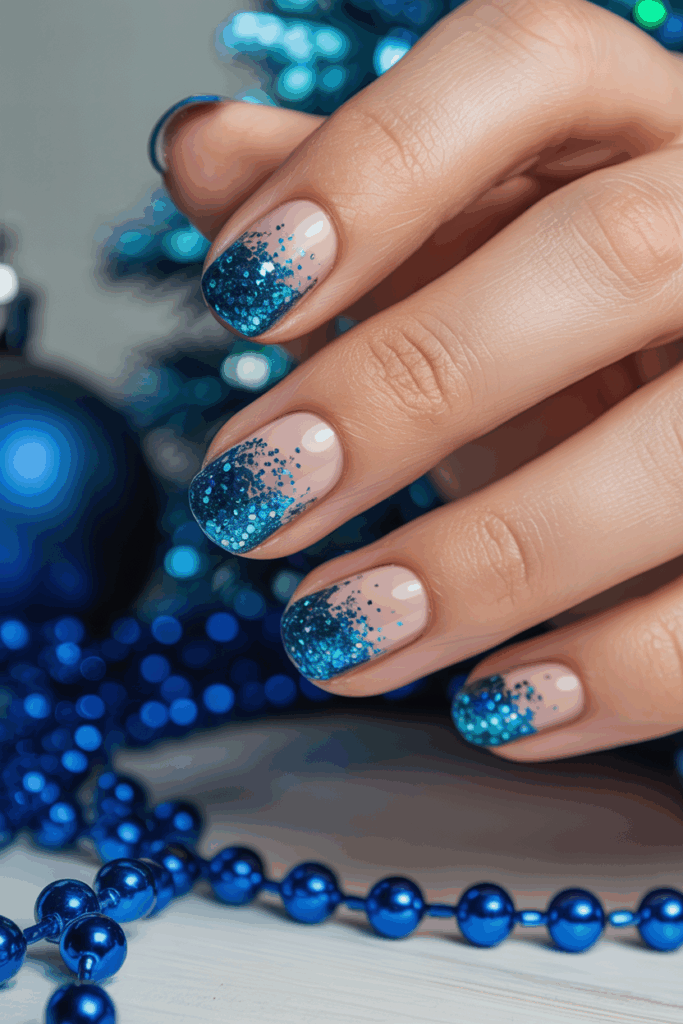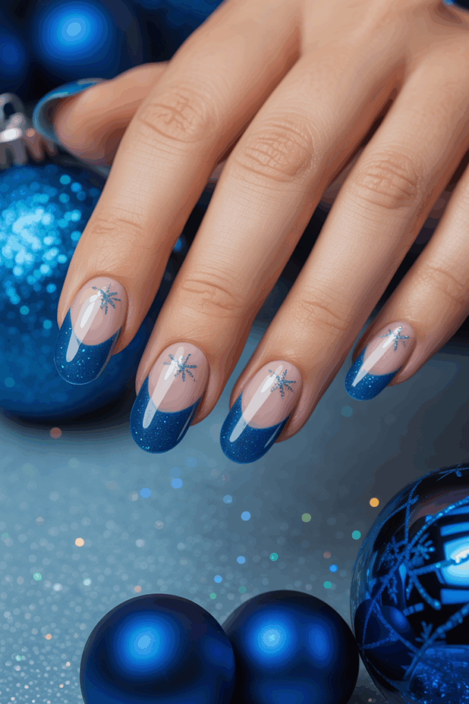 This style adds a twist to the classic French manicure by using blue tips with a sparkling finish. It combines elegance with a festive touch suited for winter.