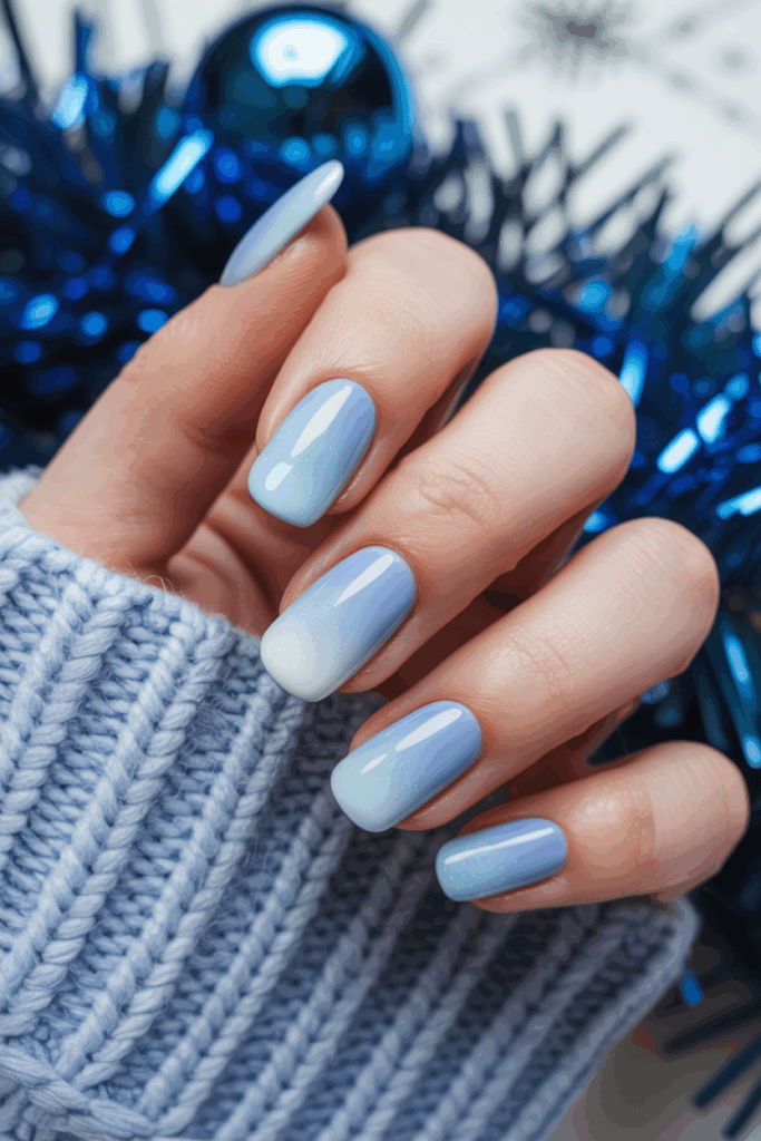 This design uses soft icy blue shades that blend smoothly from light to darker tones. It creates a cool, frosty effect on the nail tips. The gradient adds subtle depth without being too bold. It suits anyone who wants a simple but elegant winter look.