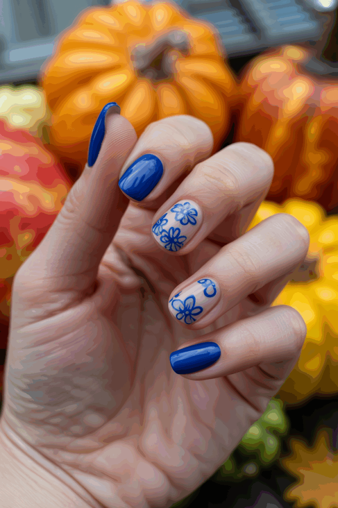 In this design, the cobalt blue is complemented by delicate floral accents. The white nails feature intricate floral patterns in shades of pink and blue. This combination creates a beautiful contrast that adds a touch of elegance.