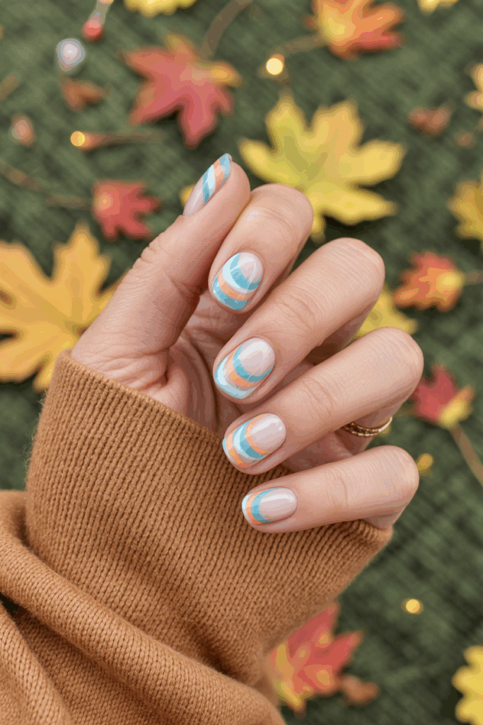 The light blue shades and subtle stitching details give a casual yet trendy vibe. This design is perfect for fall, as it pairs well with cozy outfits and warm colors. You can easily match these nails with your favorite denim jacket or jeans for a coordinated look.