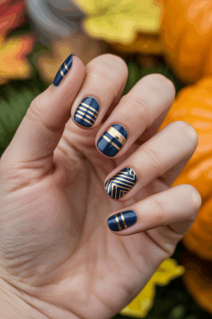 Navy and gold geometric patterns are a stunning choice for fall nails. The deep navy base provides a rich backdrop that highlights the shiny gold accents beautifully. This color combination is both classy and modern, making it perfect for any occasion.