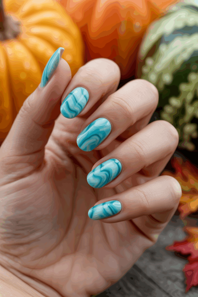 To achieve this look, you can use a simple water marbling technique. Start with a base coat of turquoise polish, then drop white polish onto the surface of water and swirl it with a toothpick. Dip your nails into the water to pick up the design. Finish with a top coat for a glossy shine!