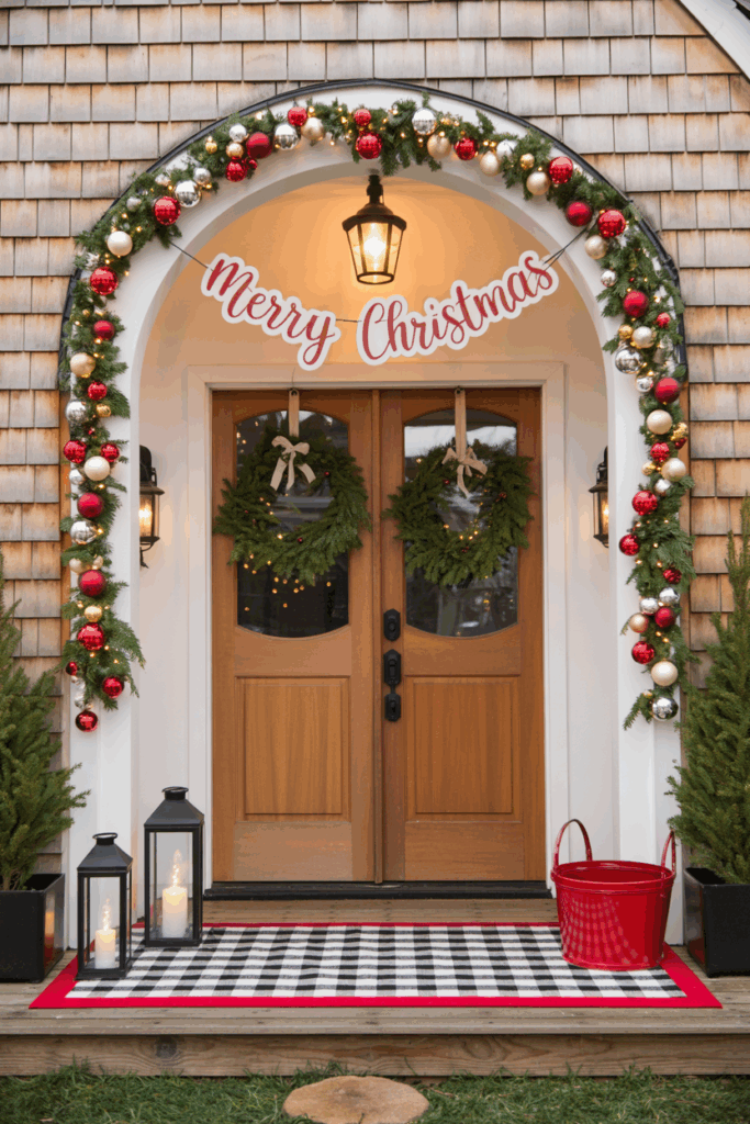 If your style leans more modern, opt for a minimalist garland with clean lines, such as cedar branches paired with sleek black or silver ribbon. Adding symmetry with matching wreaths or lanterns on each side of the doorway ties the look together and creates a festive first impression for guests.