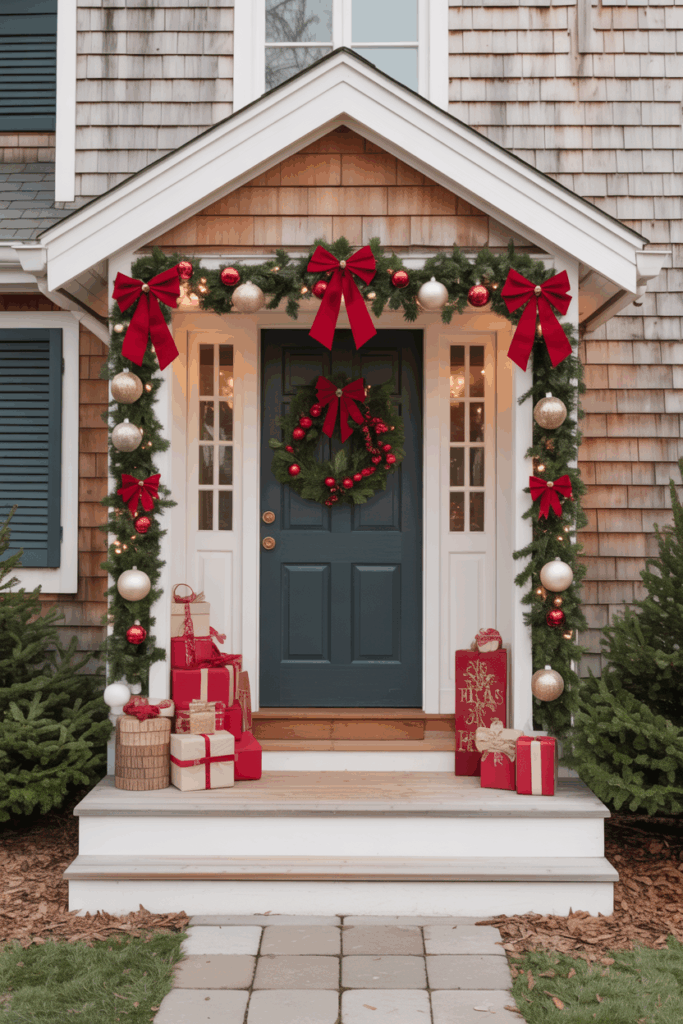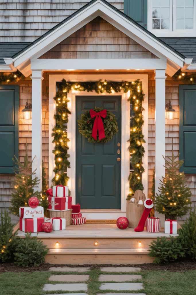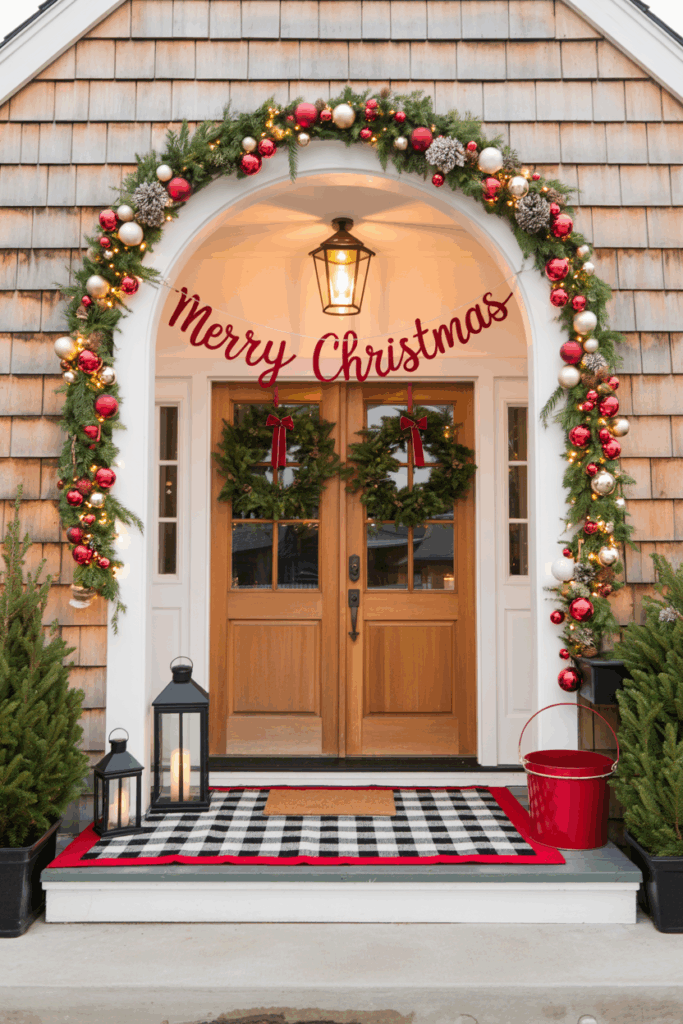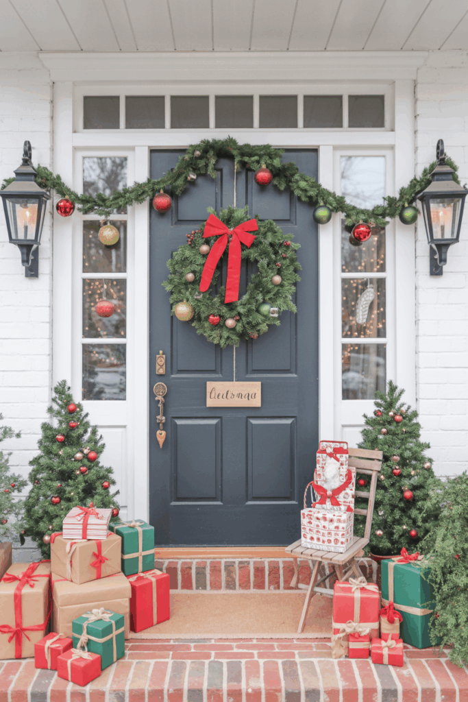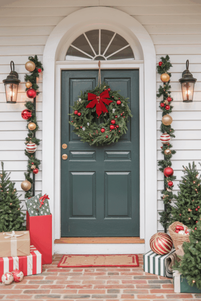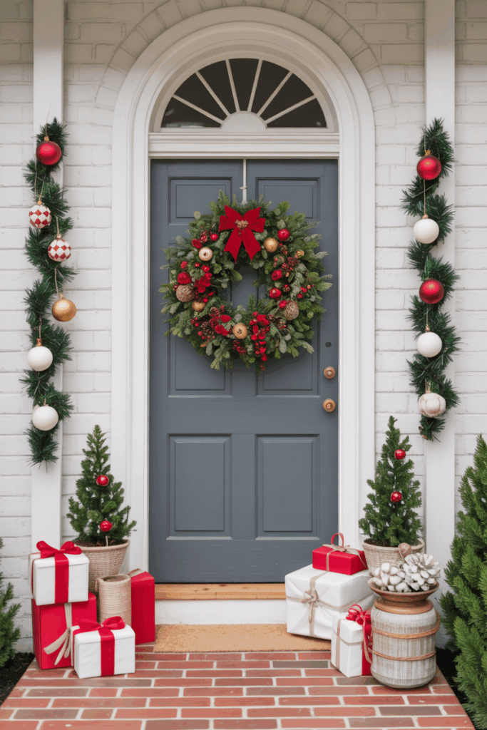 A beautiful garland framing your front door is one of the most classic ways to welcome the holidays. For a lush look, choose a thick evergreen garland and layer in accents like red berries, pinecones, and warm white fairy lights. You can also weave in ribbon in colors that match your outdoor theme — whether that’s traditional red and green, metallic gold, or soft snowy whites.