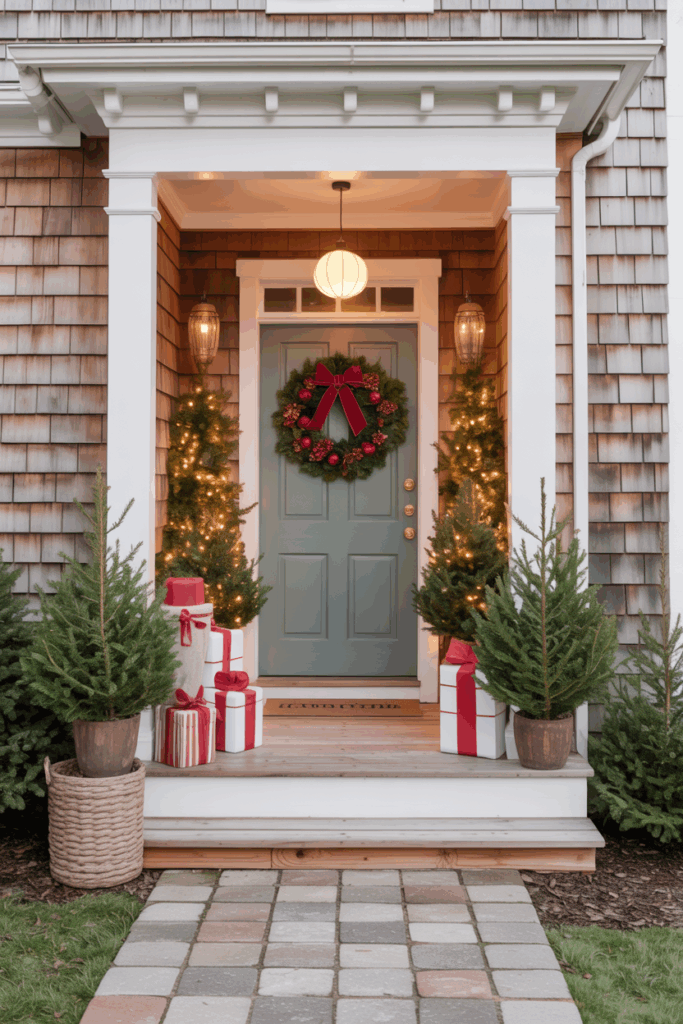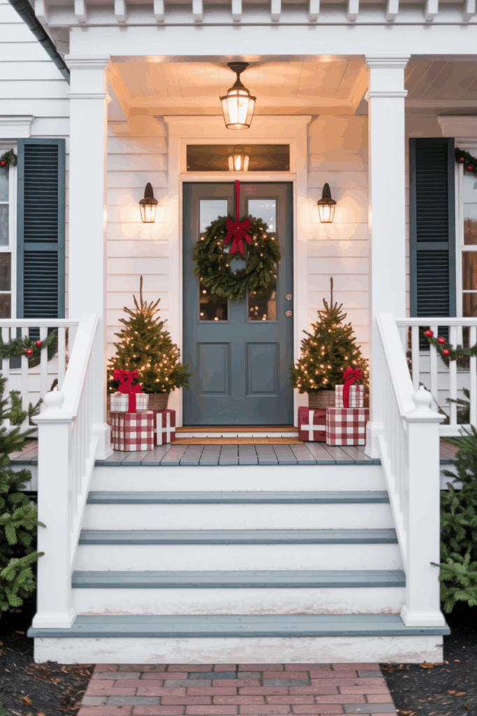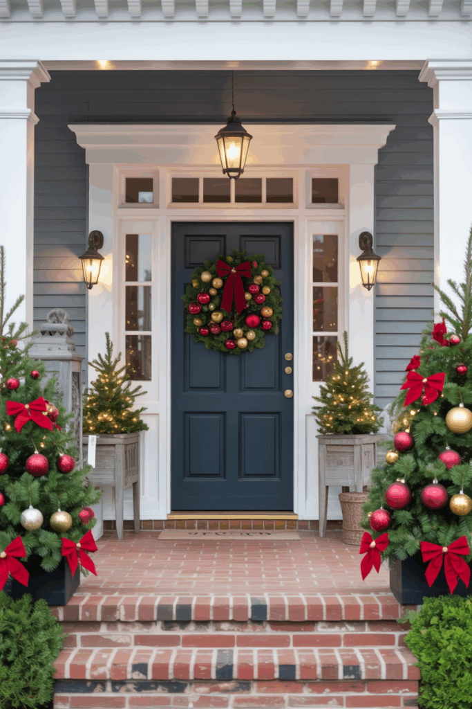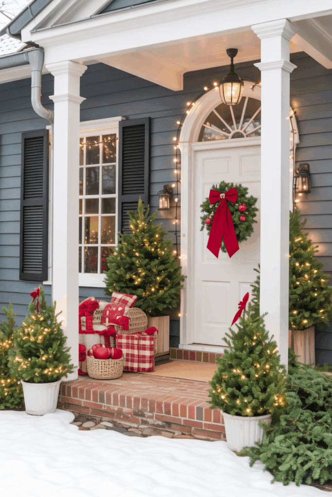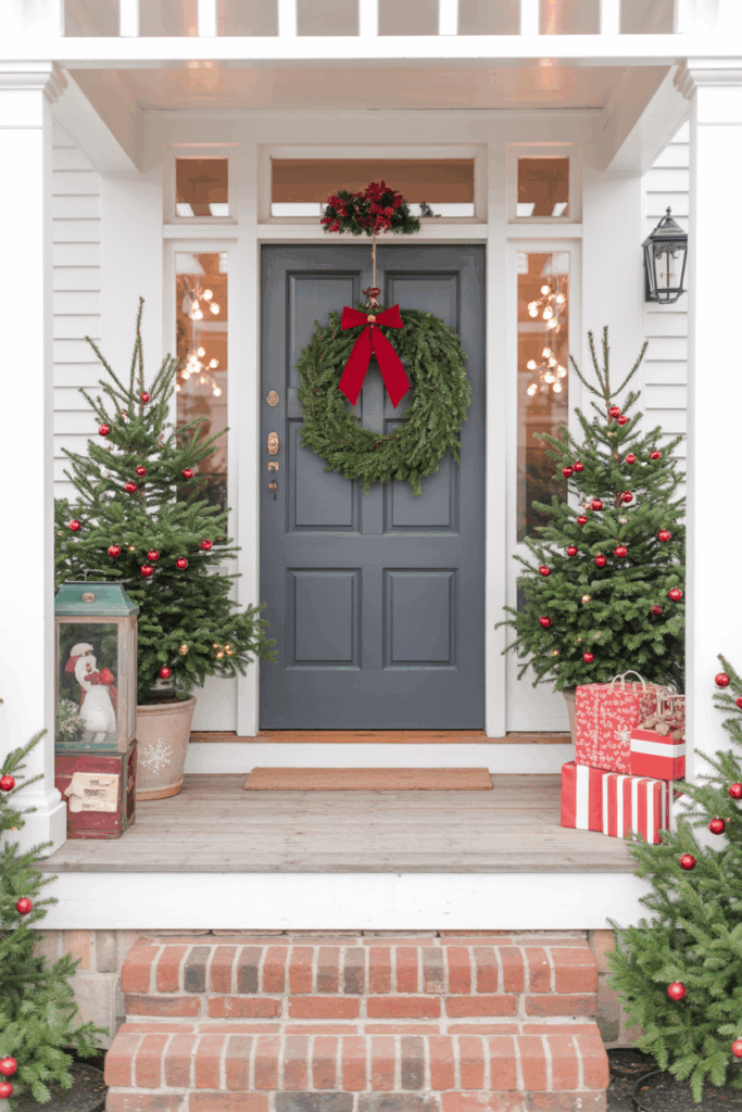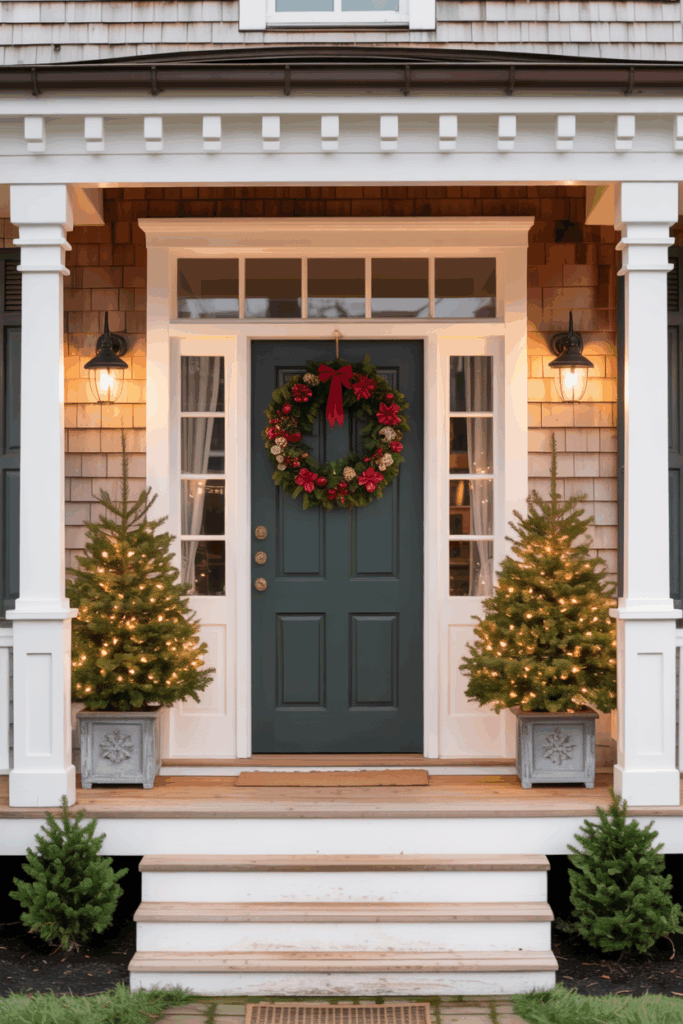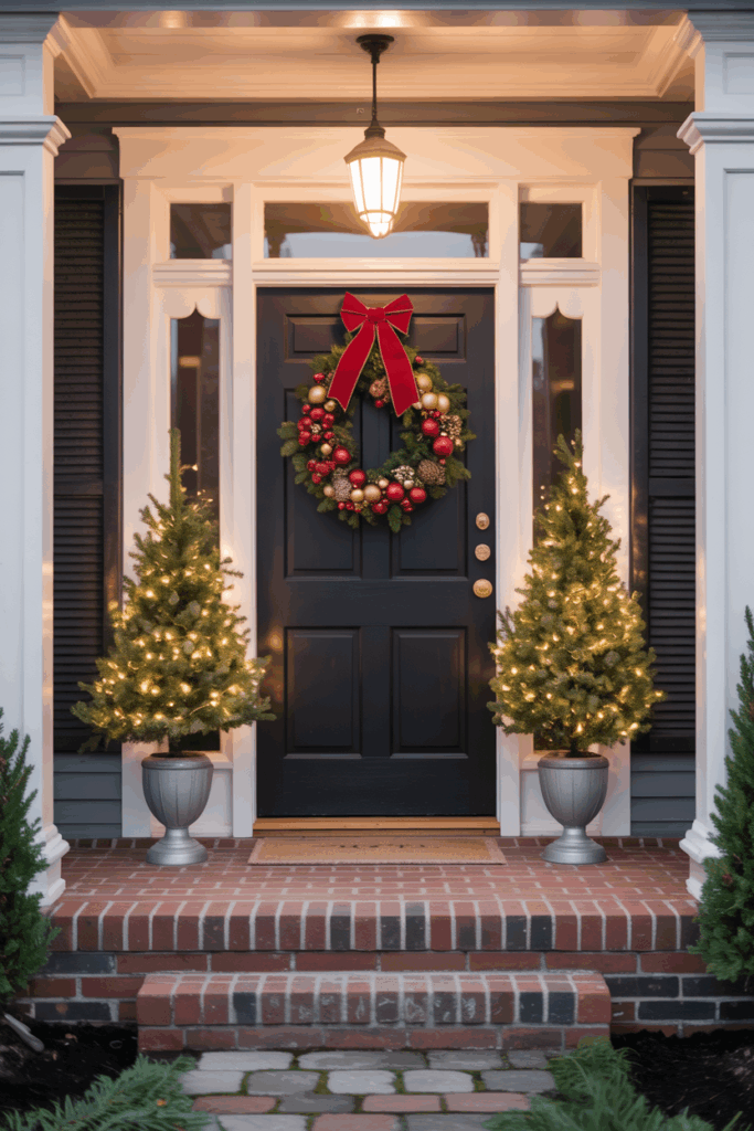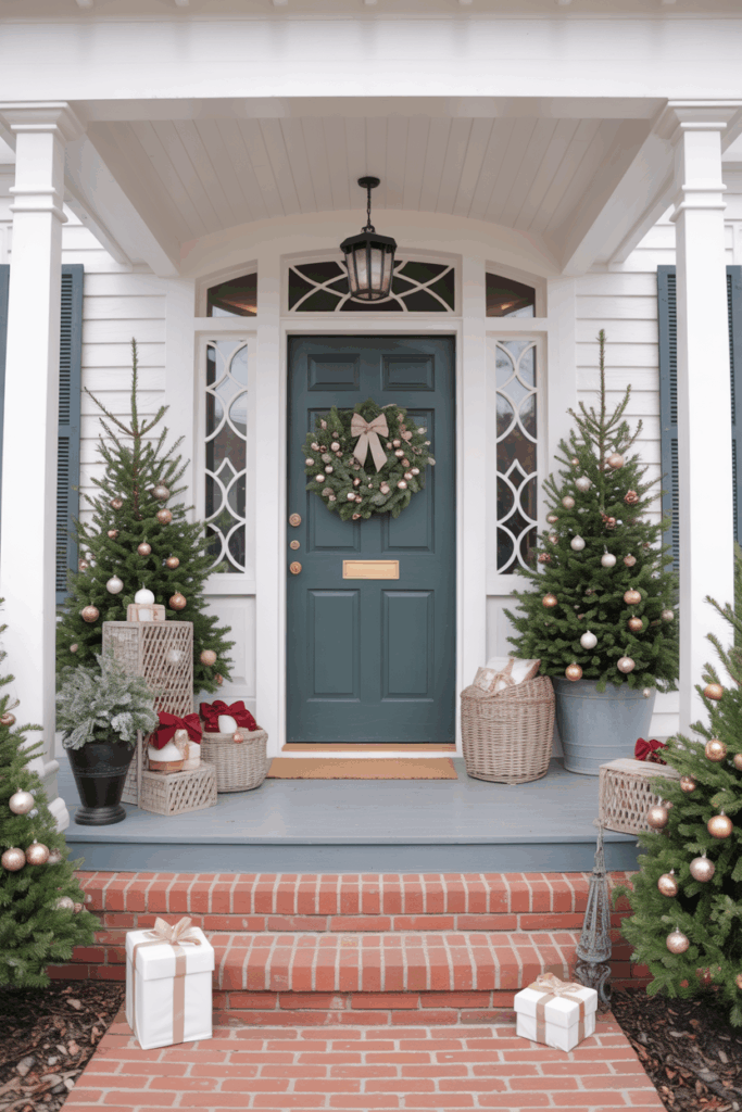 Placing two matching Christmas trees on either side of the front door provides symmetry and elegance. You can use artificial or real trees—just be sure they’re in heavy, weather-safe planters. Decorate with weatherproof ornaments and solar or battery-powered lights.