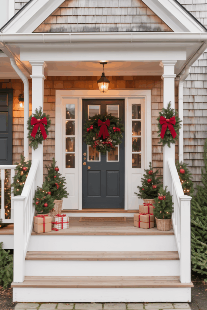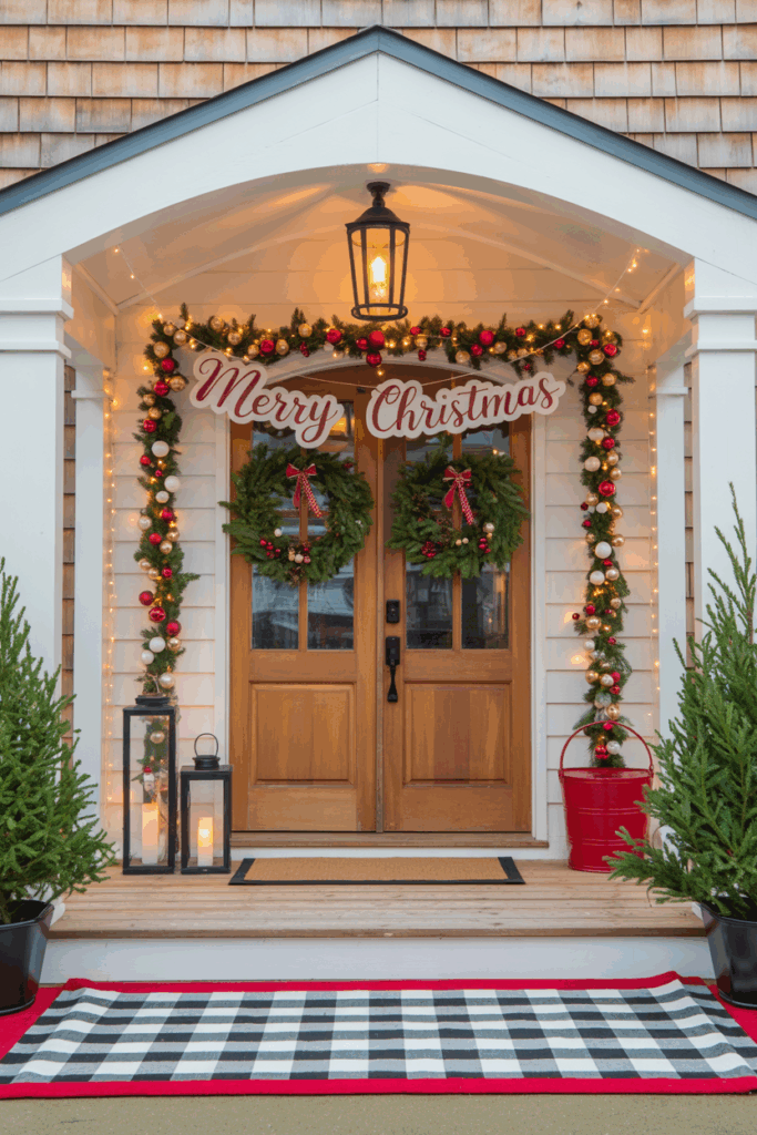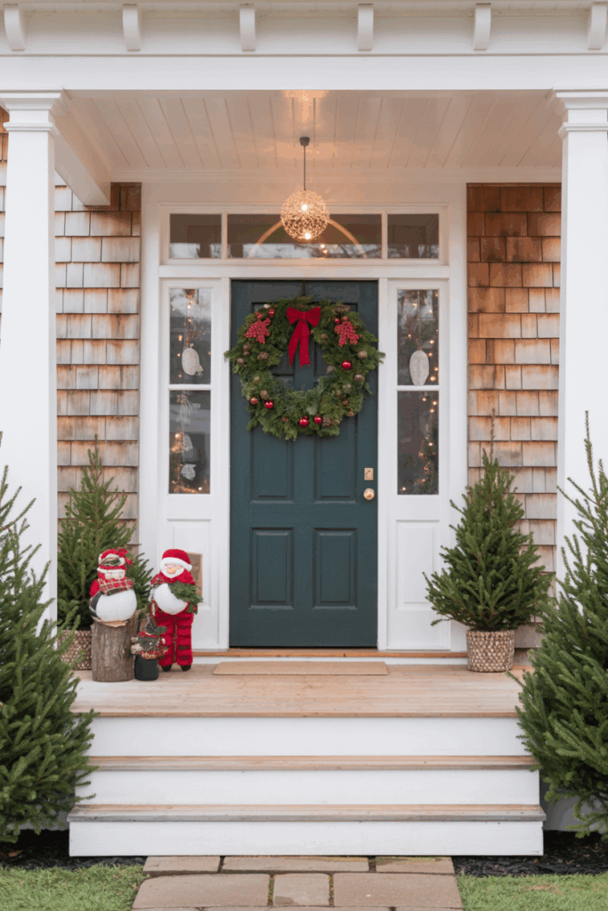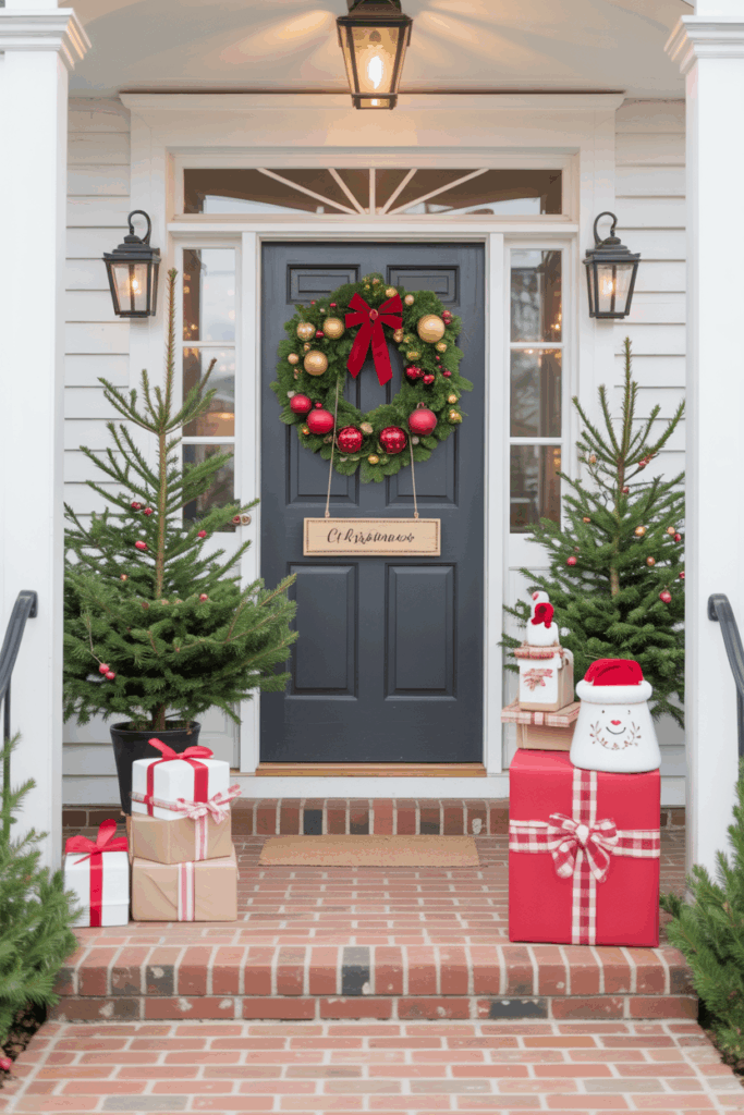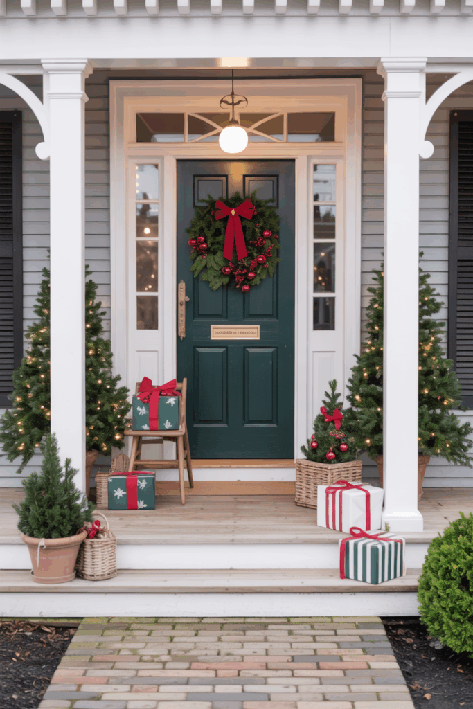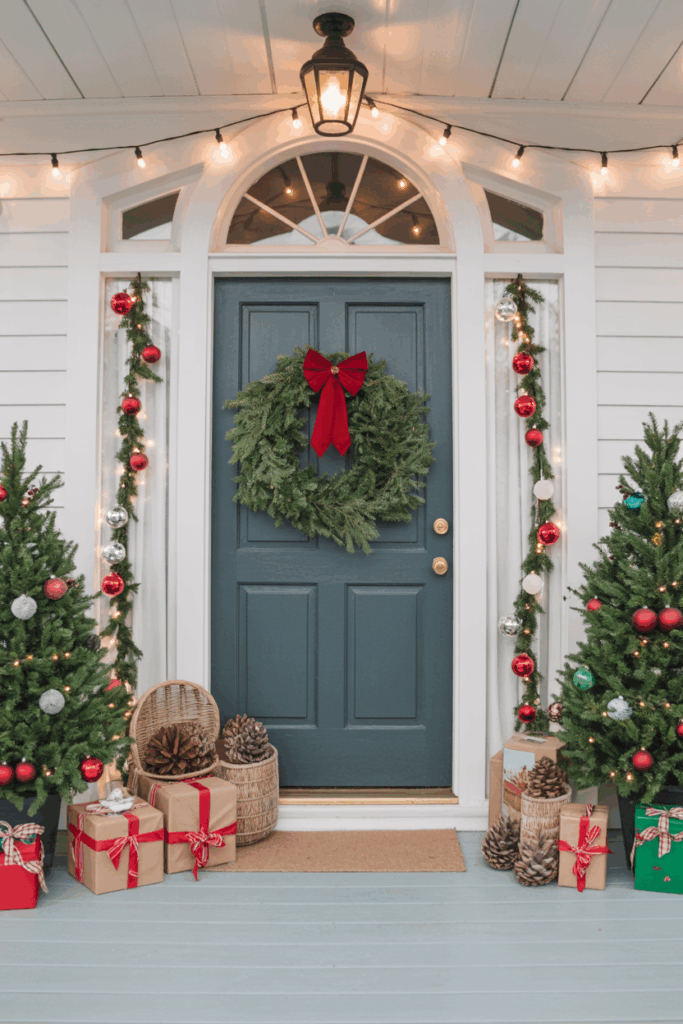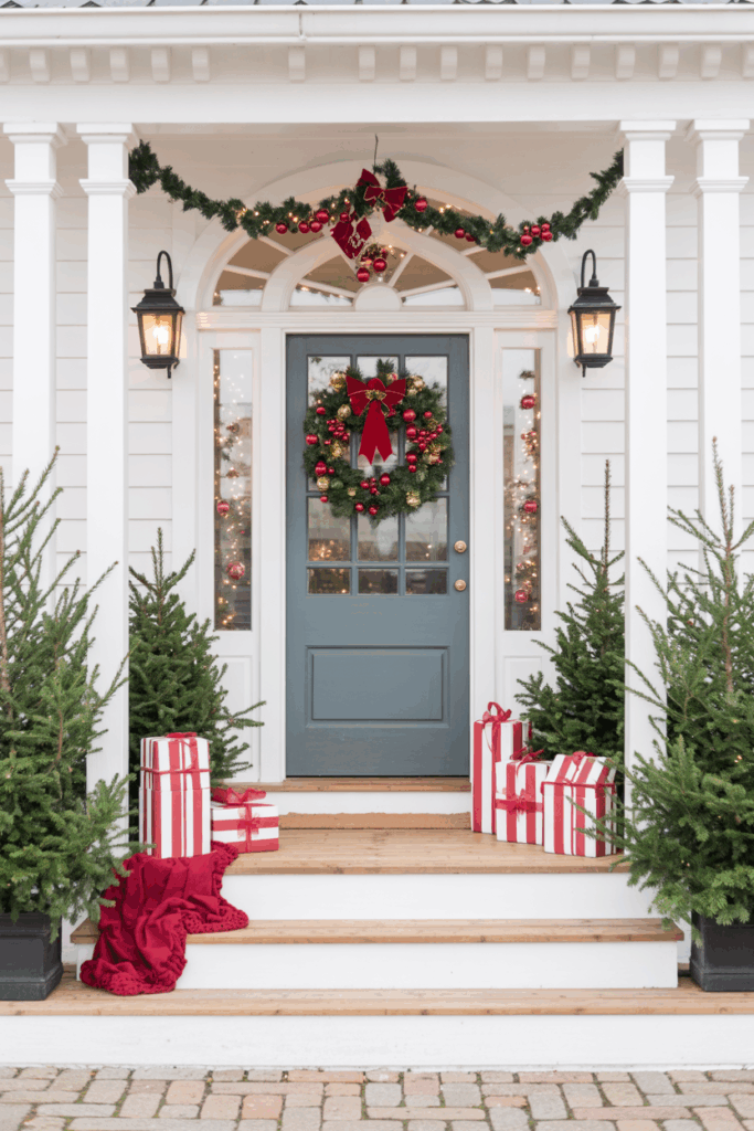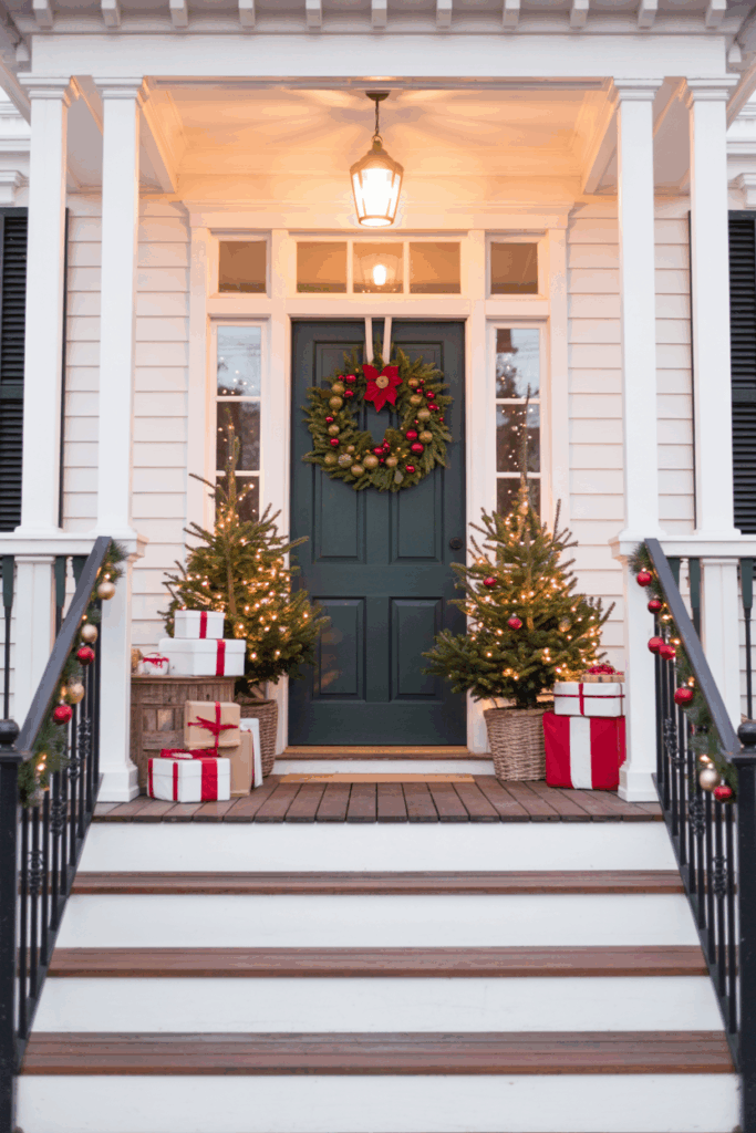 Placing two matching Christmas trees on either side of the front door provides symmetry and elegance. You can use artificial or real trees—just be sure they’re in heavy, weather-safe planters. Decorate with weatherproof ornaments and solar or battery-powered lights.