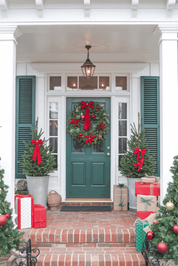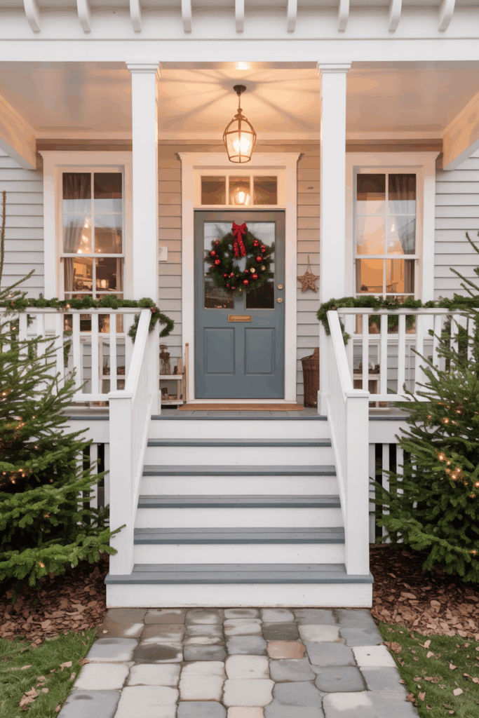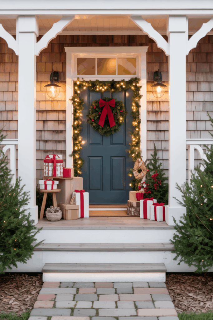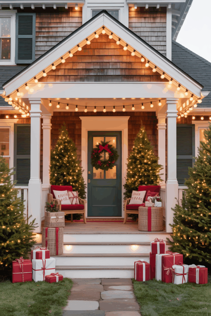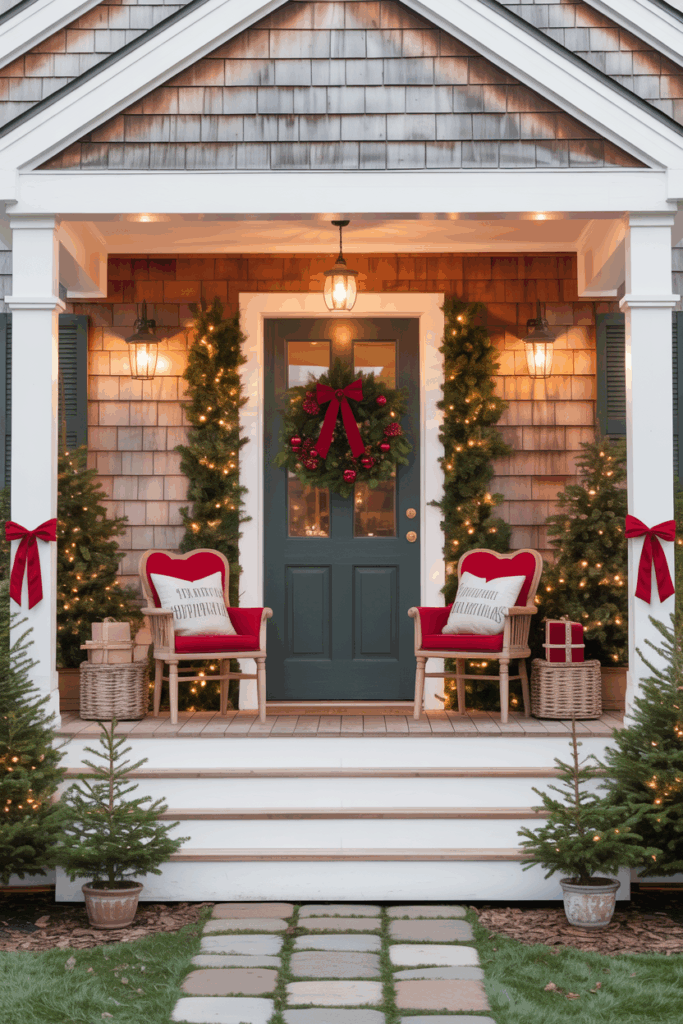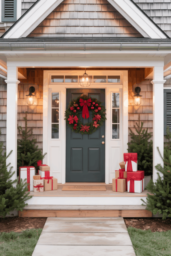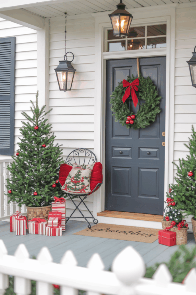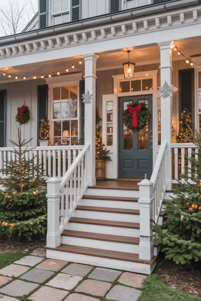 Placing two matching Christmas trees on either side of the front door provides symmetry and elegance. You can use artificial or real trees—just be sure they’re in heavy, weather-safe planters. Decorate with weatherproof ornaments and solar or battery-powered lights.