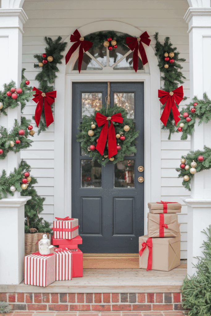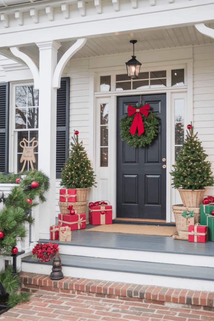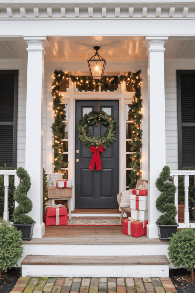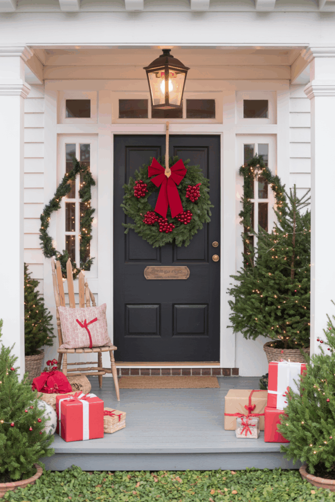 An oversized wreath instantly becomes the focal point of your front porch. Choose one that suits your style: flocked for a wintry feel, traditional green with red berries, or even a minimalist metal wreath with eucalyptus. Hang it with a wide velvet ribbon or a bold plaid bow for maximum impact.