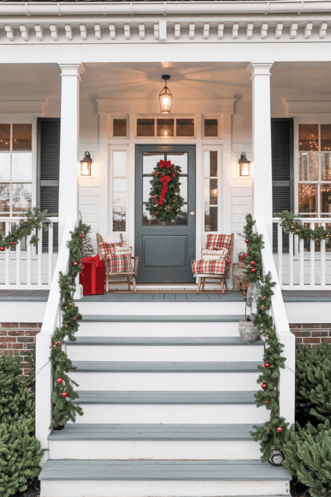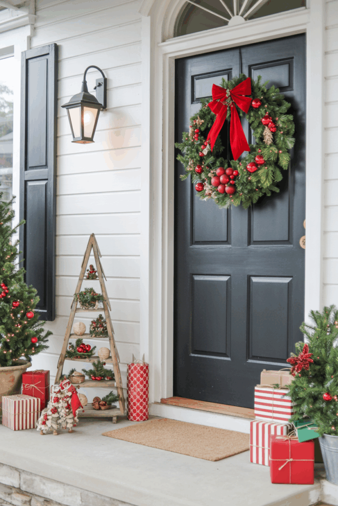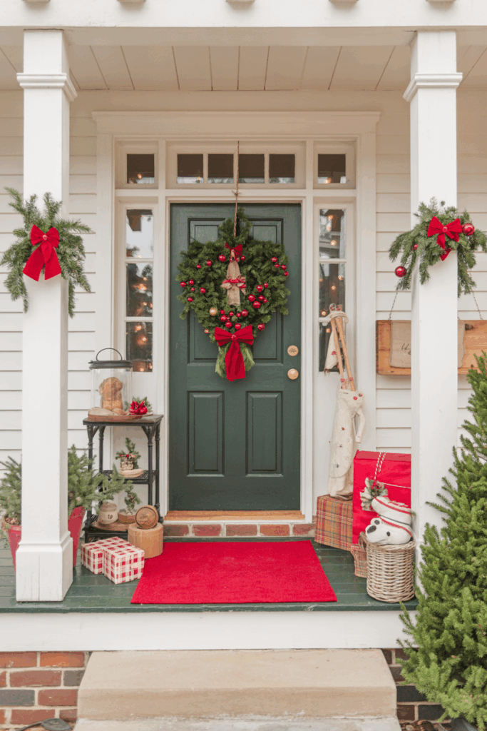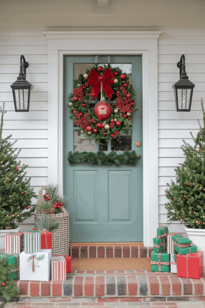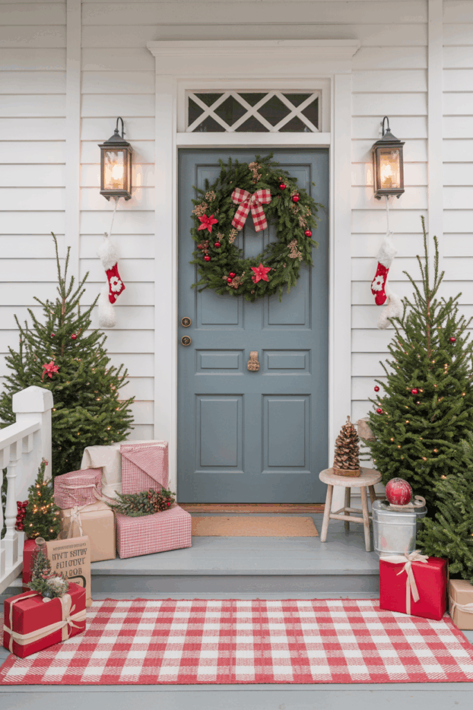 An oversized wreath instantly becomes the focal point of your front porch. Choose one that suits your style: flocked for a wintry feel, traditional green with red berries, or even a minimalist metal wreath with eucalyptus. Hang it with a wide velvet ribbon or a bold plaid bow for maximum impact.