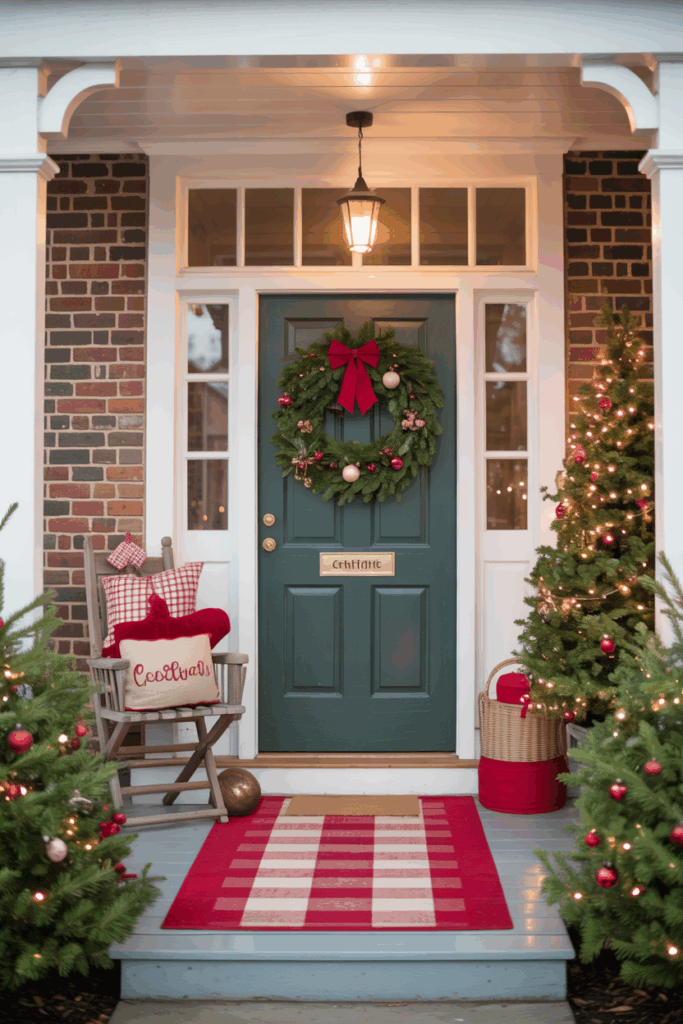 Start with a large neutral or plaid outdoor rug, then layer a festive holiday doormat over the top. Choose greetings like “Let It Snow,” “Merry & Bright,” or “Happy Holidays” to greet guests with cheer.