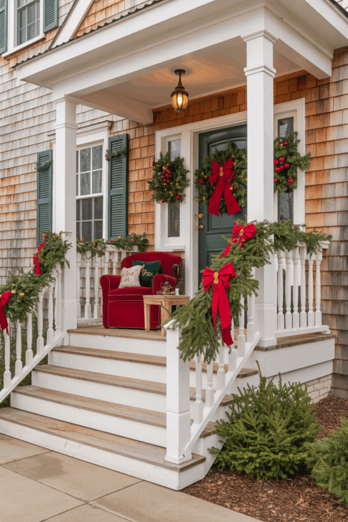 If your porch has windows or a railing, use them as extra spots to bring in seasonal decor. Hanging wreaths in each window creates a unified look from both outside and inside the home. A simple ribbon in red, gold, or silver can secure them in place while adding a decorative flourish.