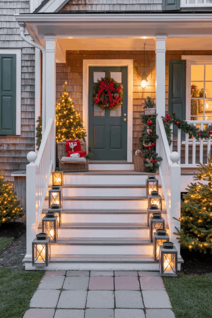 Line your front steps with a series of outdoor lanterns in varying heights. Use LED candles or fairy lights inside and add accents like mini ornaments or faux snow for added holiday flair. Group in odd numbers for a designer look.