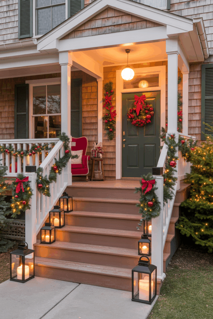 Lanterns filled with candles or fairy lights are a timeless way to make your porch glow during the holidays. Place them on each step for a symmetrical look, or cluster them in odd numbers at one or two key spots for a more relaxed style. Tall black lanterns give a classic, elegant feel, while gold or white lanterns can make your space feel light and festive.