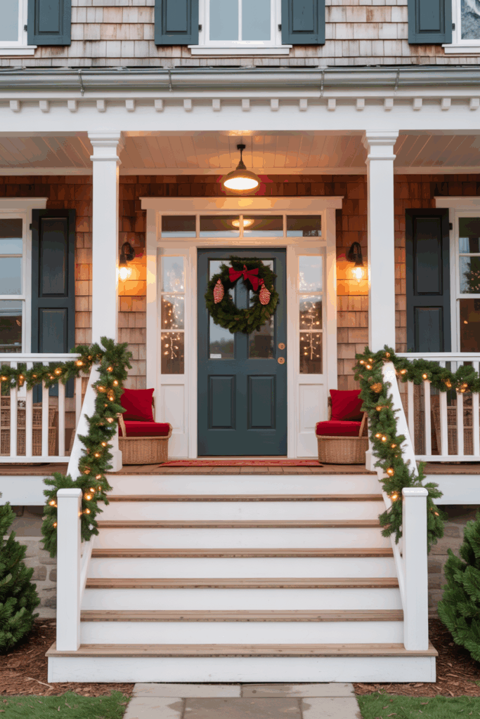 Wrap porch railings and columns with lush evergreen garlands to give your entry a full and festive feel. Opt for pre-lit versions or weave in your own fairy lights. Add ribbon, pinecones, or shatterproof ornaments to elevate the look.