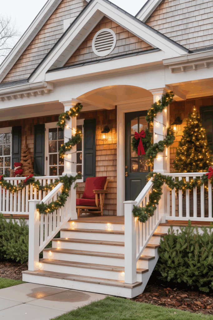 For railings, drape evergreen garland and weave in lights, ribbon, or ornaments. If you’re aiming for a more playful style, add oversized bows at the corners or clusters of hanging bells for a bit of holiday jingle every time the wind blows.