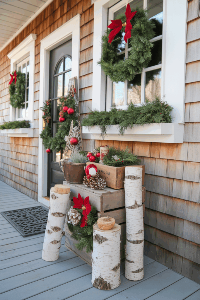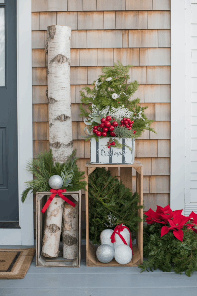 Use old wooden boxes or sturdy baskets as risers to elevate trees, lanterns, or gift boxes. Varying height makes your porch display more dynamic and visually interesting.