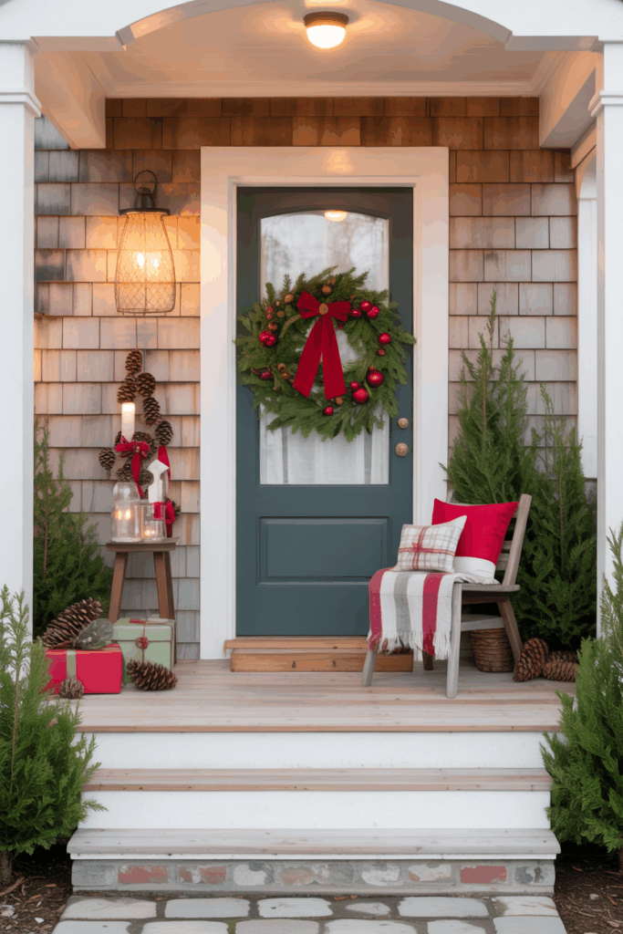 The wreath on your front door sets the tone for your porch decor and is often the first detail visitors notice. A full, traditional wreath with holly, berries, and ornaments makes a bold statement, while a snowy flocked wreath feels wintry and elegant. You can even create a themed wreath — such as coastal Christmas with seashell accents or rustic charm with plaid ribbon and wooden ornaments.
