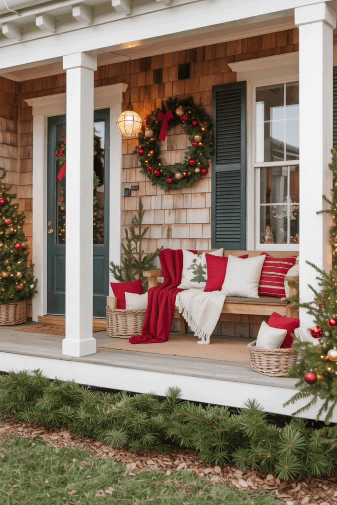 Mix textures for visual interest — pair a soft faux fur pillow with a chunky knit throw, or combine tartan patterns with neutral tones for a balanced look. Even if you rarely sit outside in December, these layered details add depth to your porch decor and make it feel lived-in and welcoming.