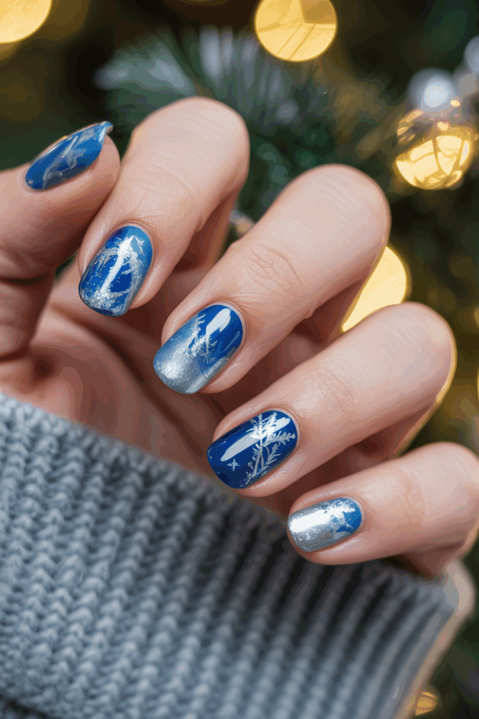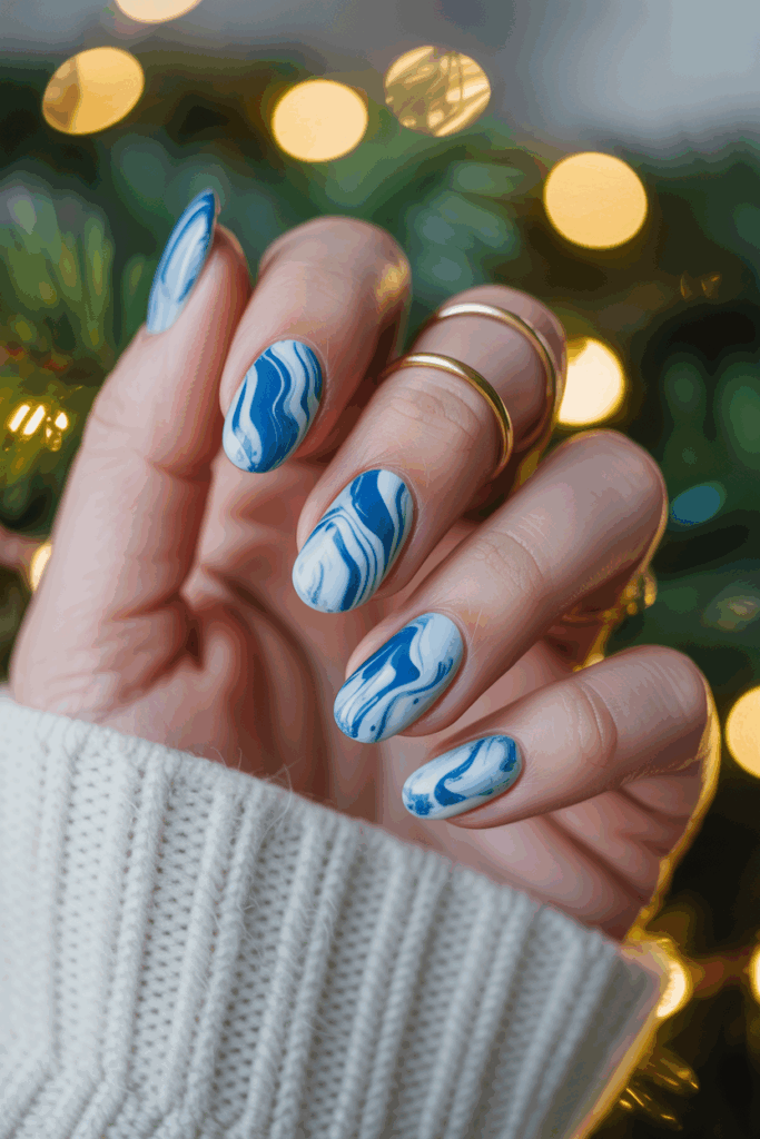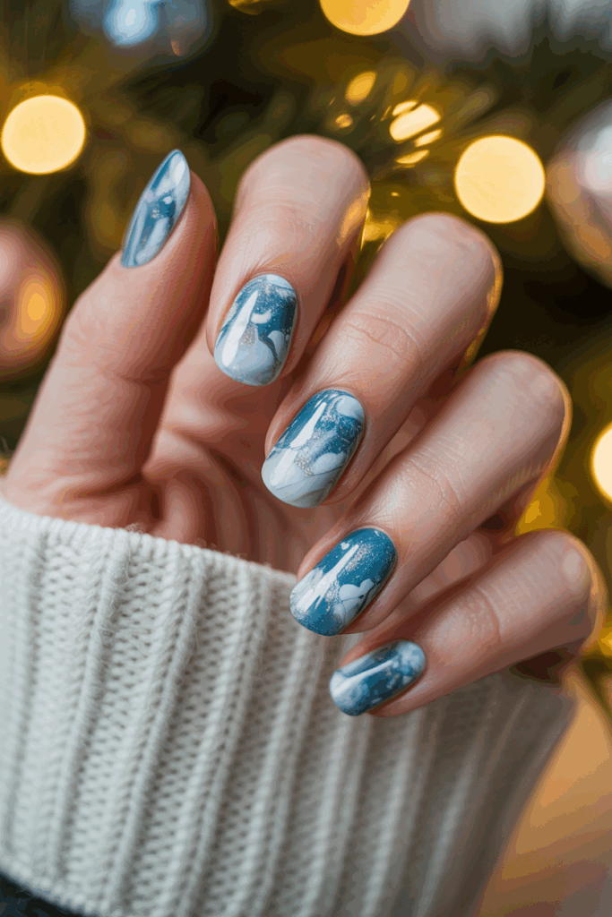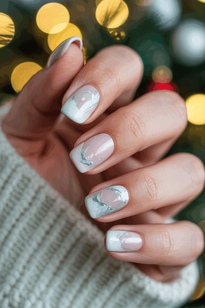 This style combines cool blue shades with silver accents for a fresh, wintery look. The marble effect adds a soft, frosty texture that fits the holiday season. It works well on both natural and acrylic nails, giving a sleek, elegant finish.