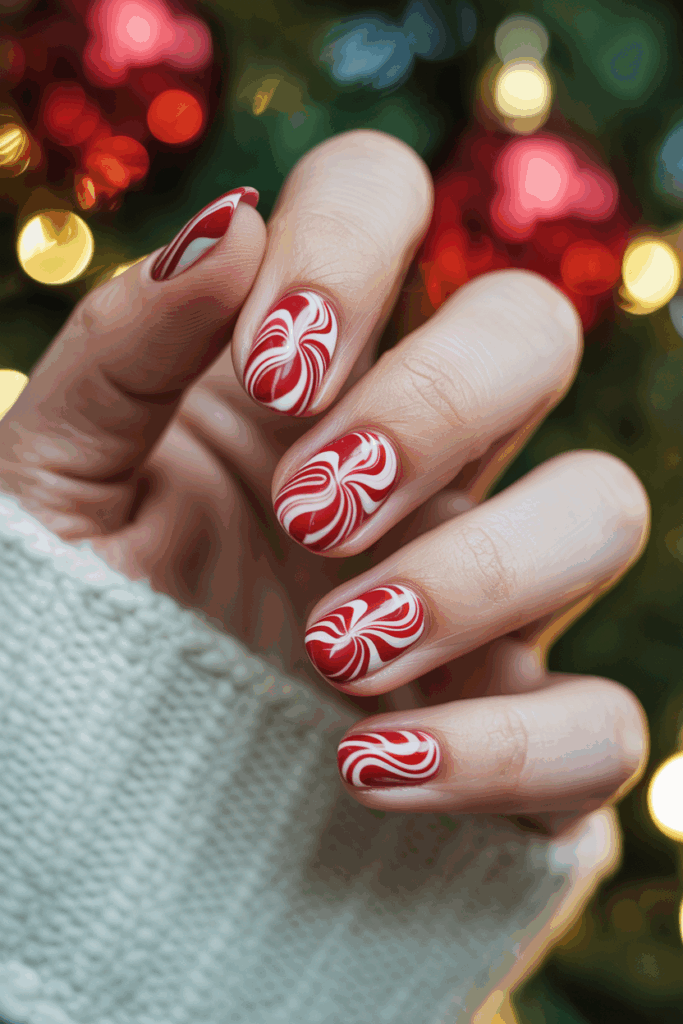 This nail design uses a white base with red swirls, mimicking a candy cane pattern. The marble effect gives it a smooth, blended look. It fits well for those who want a simple but festive Christmas style.