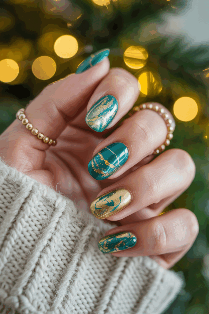 This design uses gold and green teal colors to create a rich, festive style. The marble effect adds depth and texture, making nails stand out without being too flashy. It suits holiday events where a refined, elegant look is desired.