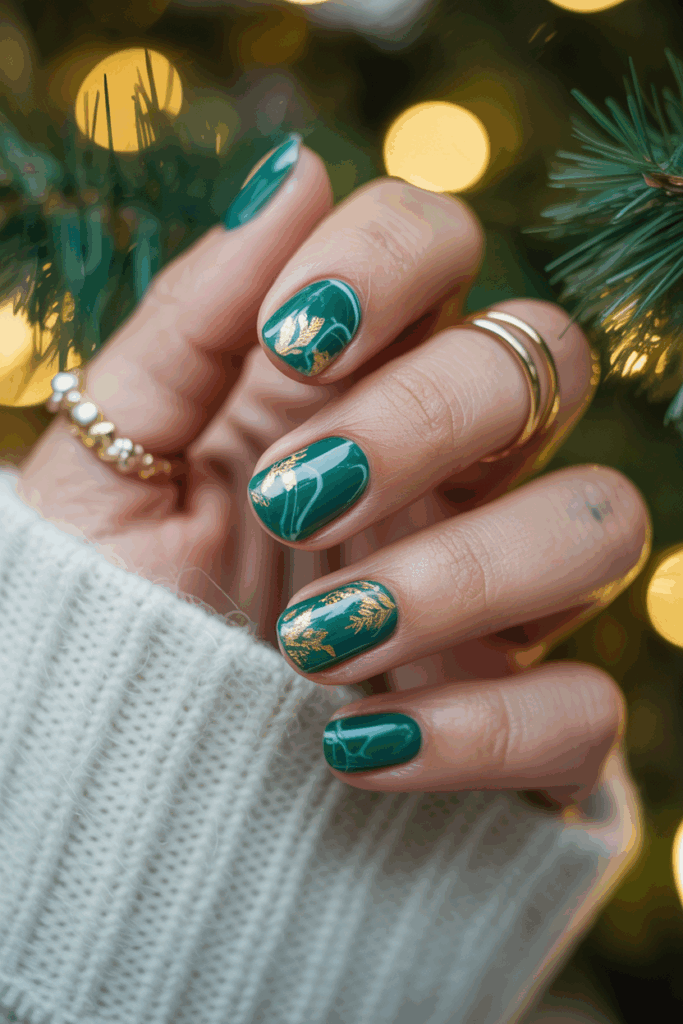 This design uses deep green shades to create a marble effect on the nails. Thin, shiny pieces of gold leaf add detail and contrast. The combination looks elegant and festive, making it a popular choice for Christmas nail styles.