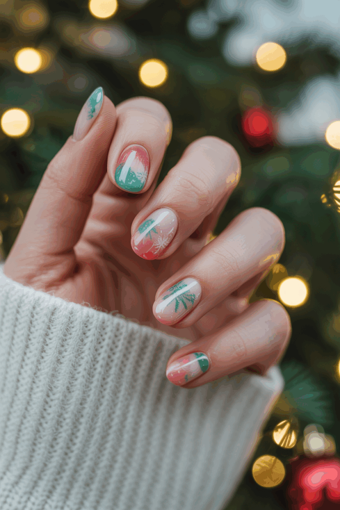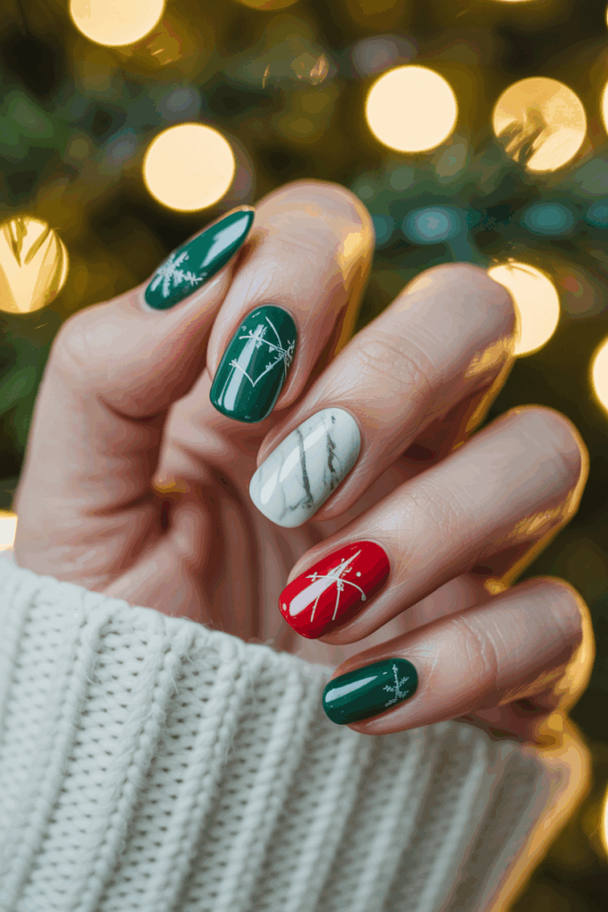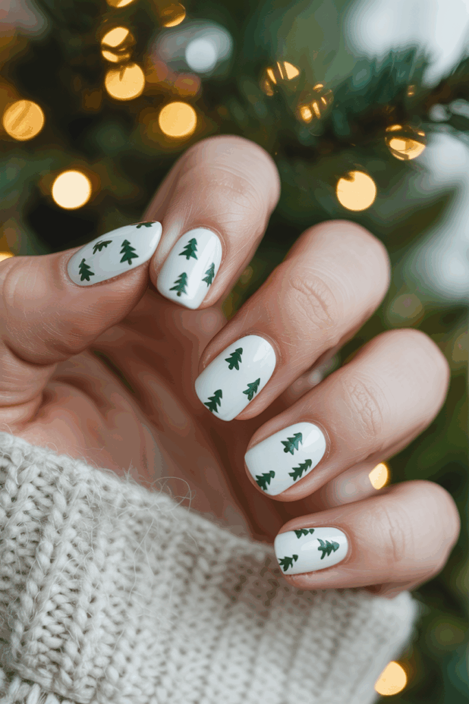 This design uses a white marble base for a clean, wintery look. Small Christmas tree patterns are added on top for subtle holiday charm. The tiny trees can be created using fine brushes or nail stickers. It’s a simple but elegant style for festive nails.