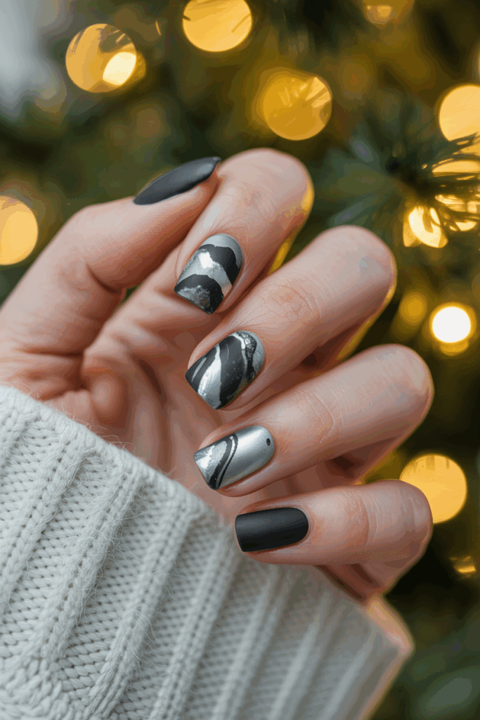 This design combines matte black with shiny silver for a sleek look. The silver marble patterns stand out clearly on the dark background. It is a modern choice that fits well with holiday themes without being too bright.