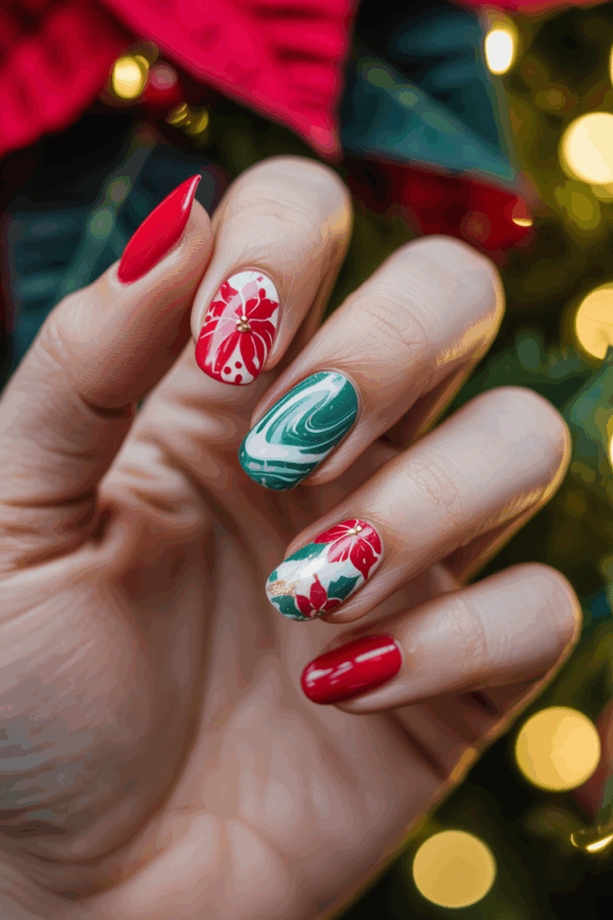 Poinsettia water marble nails use red, green, and white colors to create a floral pattern. The design resembles poinsettia flowers, which are popular during Christmas.