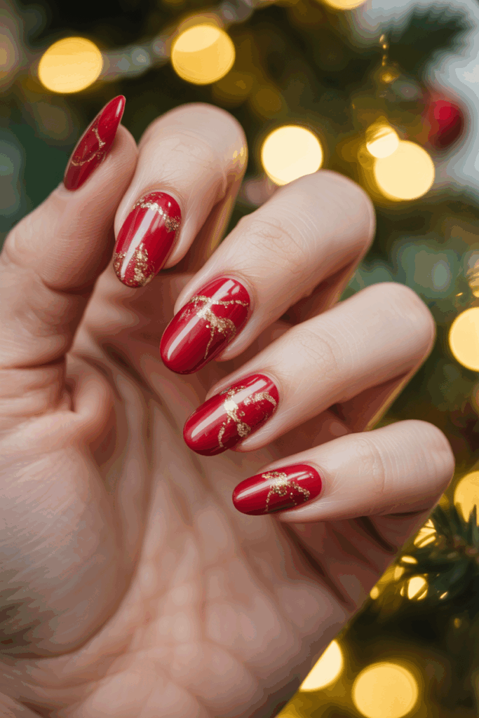 This design mixes red and gold marble for a classic Christmas look. Glitter accents add sparkle without overwhelming the nails.