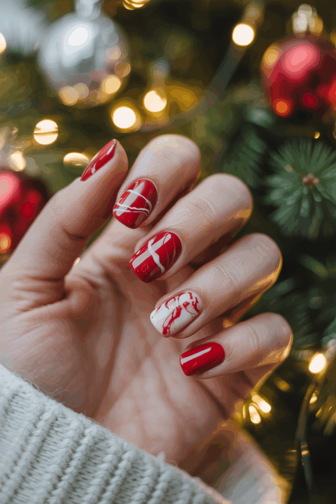 This design uses red and white polish to create thin, striped marble patterns. It looks like a wrapped ribbon on nails. The effect is simple but festive, making it a good choice for holiday gatherings. It pairs well with solid colors or simple accents.