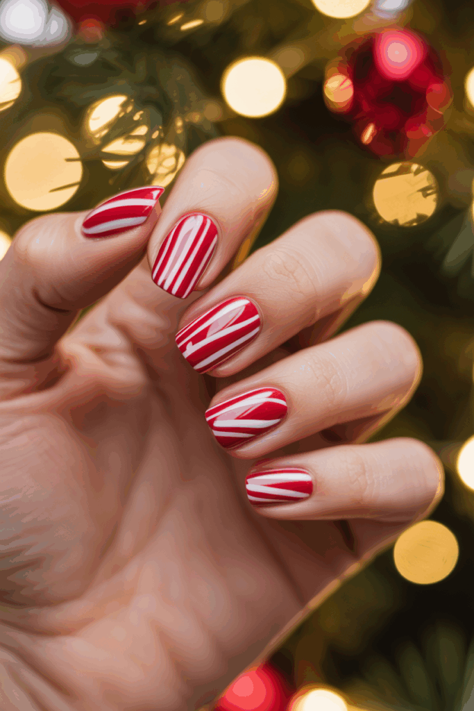 This design features red and white swirls that mimic the look of a candy cane. The pattern is simple but festive, making it a popular choice for the holiday season. It works well on all nail shapes and sizes.