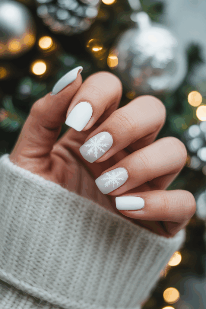 This style often uses simple designs like snowflakes or subtle glitter for a soft festive effect. It works well on acrylic nails for durability and elegance.