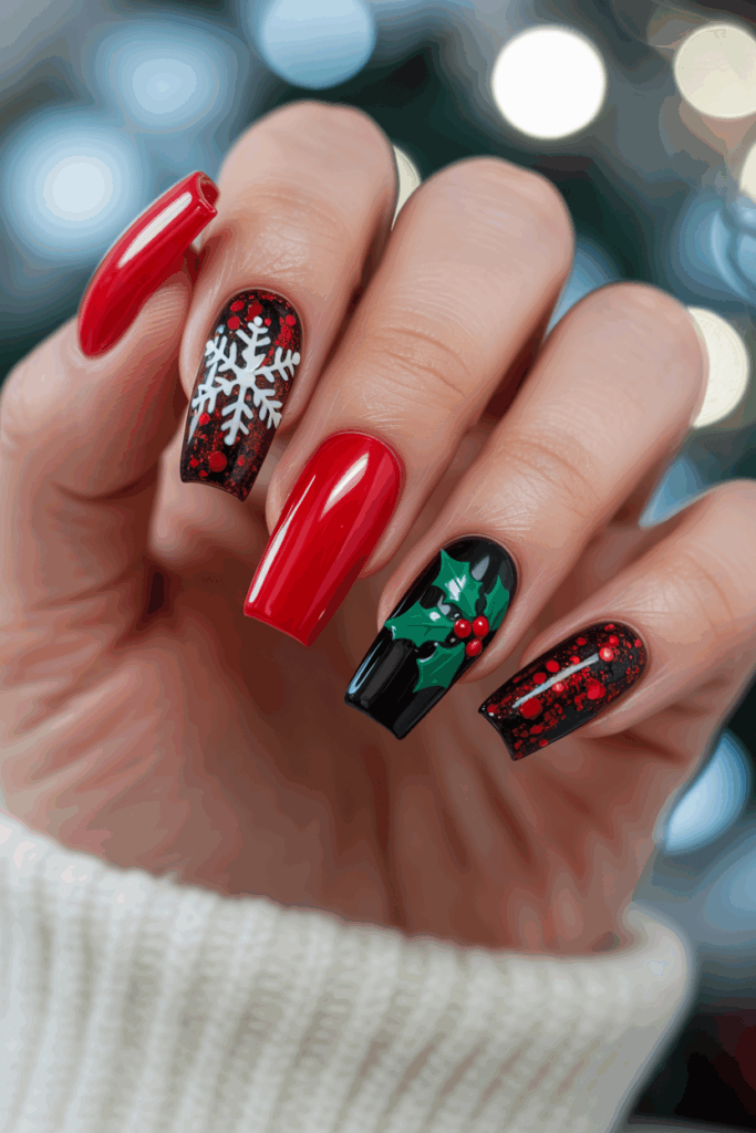This design uses red and black for a bold Christmas look. The contrast highlights each color well. It often includes simple patterns or accents like stripes or dots. This style suits those who want a festive but modern manicure.
