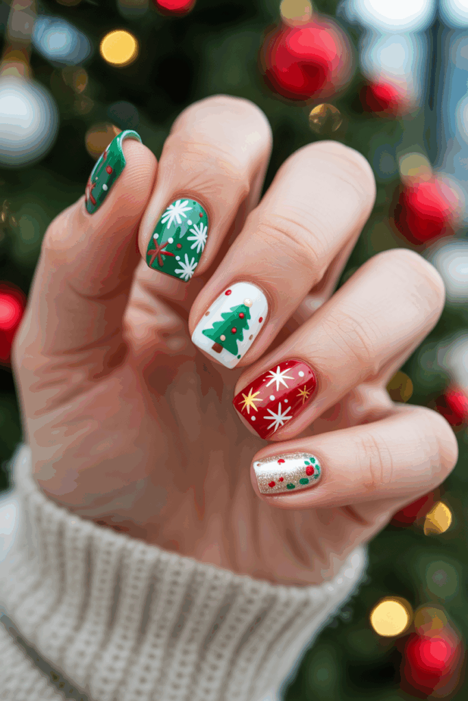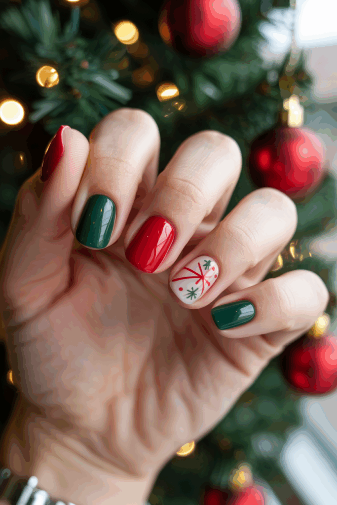This look often uses red, green, or blue bases with white snowflake accents. It suits those who want a simple yet festive style.