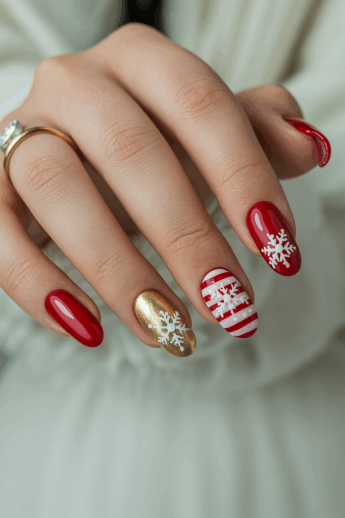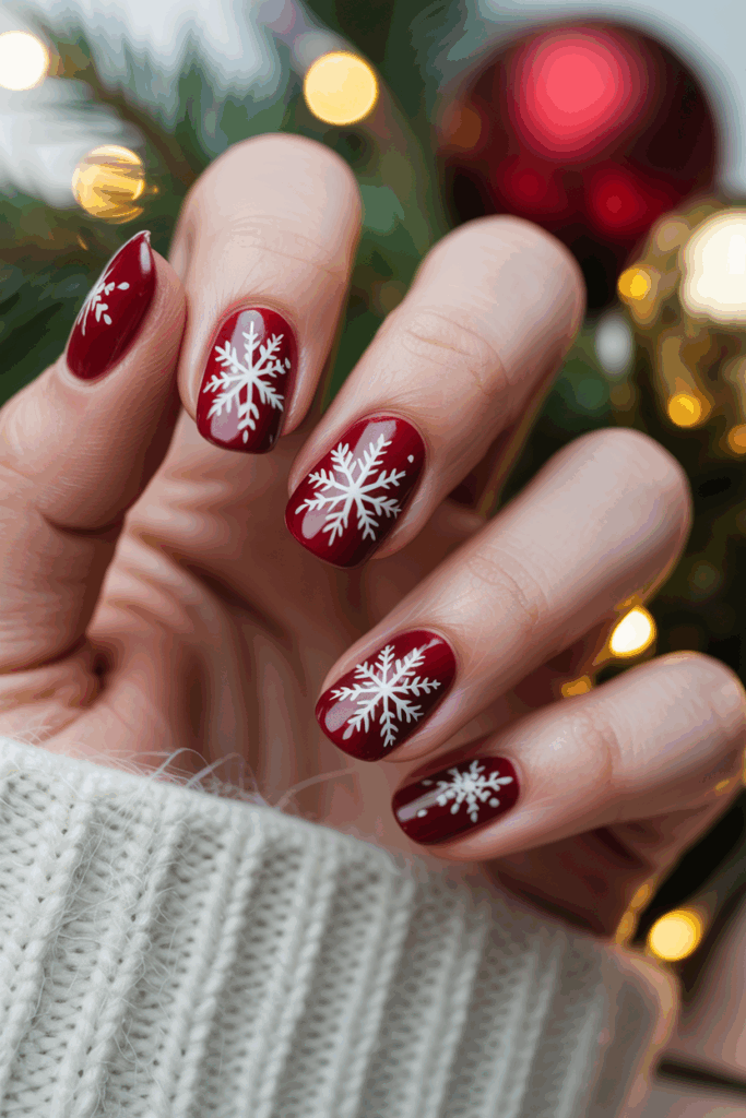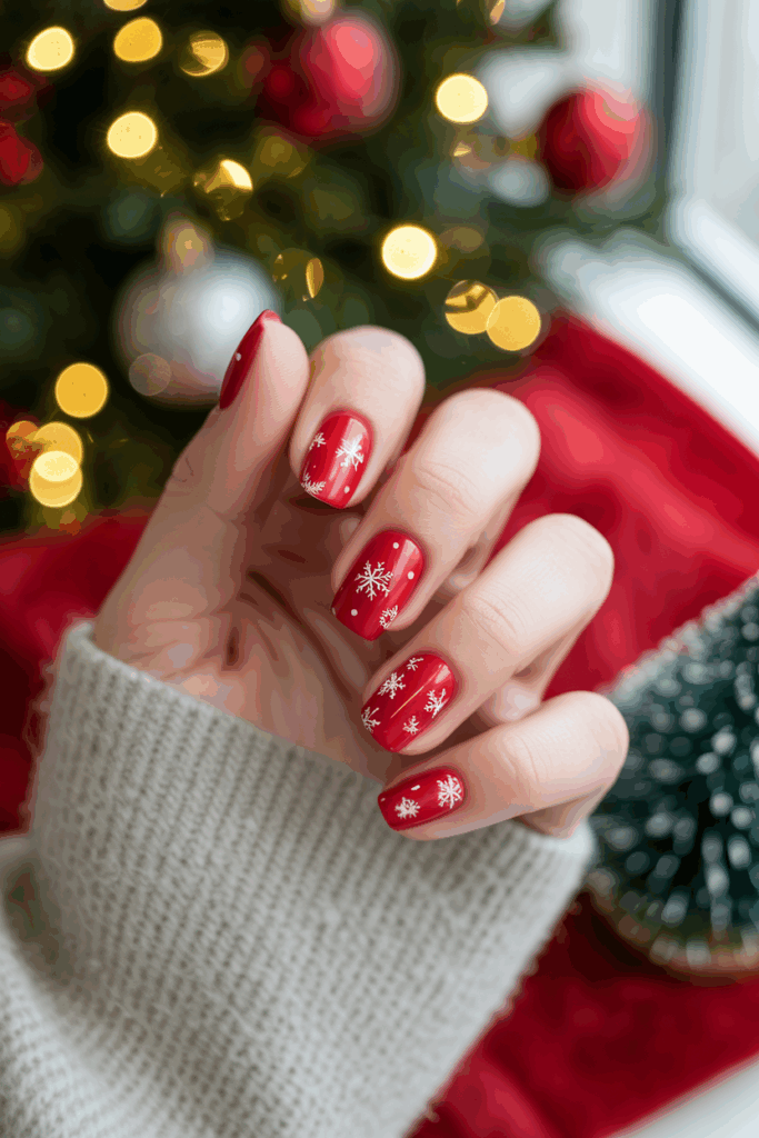 Red nails with tiny white snowflakes create a simple and festive look. The contrast between the red base and delicate snowflake details adds a wintery charm. This design works well as an accent on one or two nails or across all nails for a cohesive holiday style.