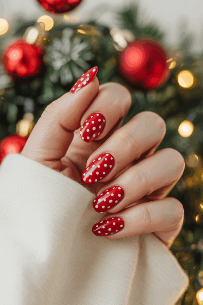 This design uses a red polish as the base color with white dots added on top. It creates a simple yet festive look.