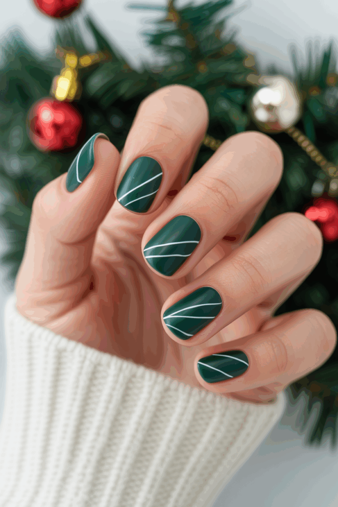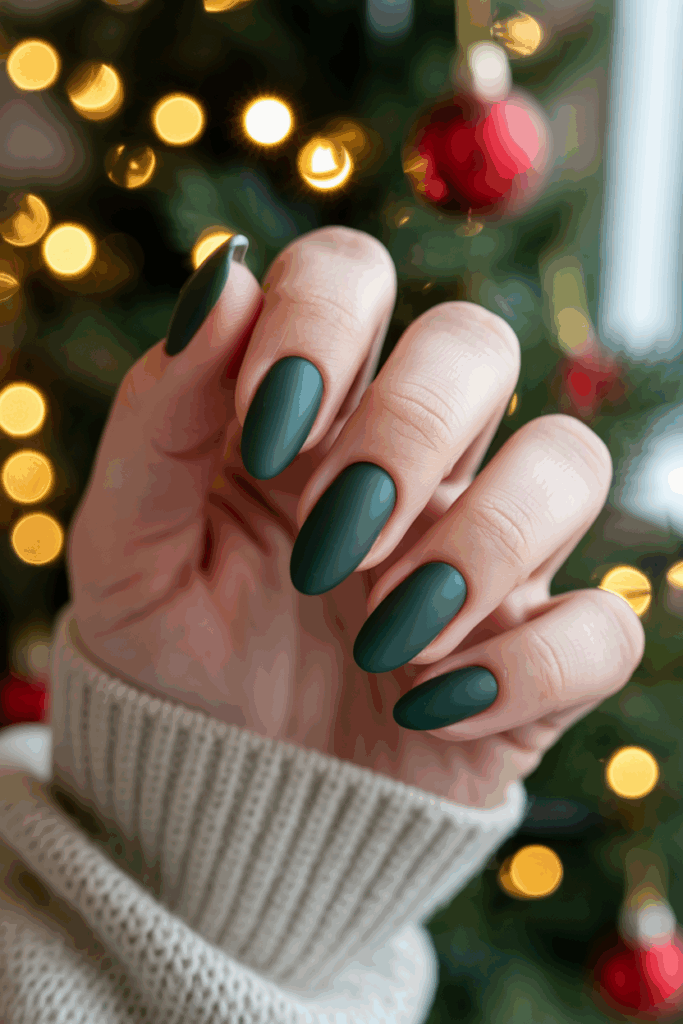 Matte emerald green nails offer a rich, deep color perfect for the holiday season. The matte finish gives a modern and elegant look without extra shine. Some designs add subtle glitter or glossy tips to create contrast while keeping the style simple and chic.