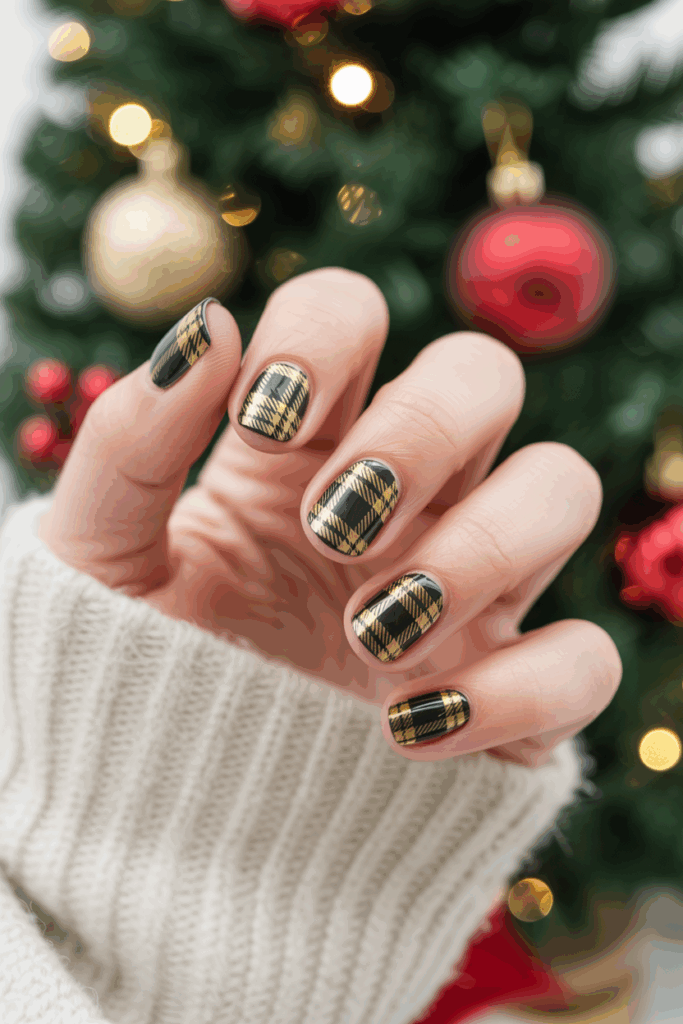 24) Plaid Nails with Gold Highlights