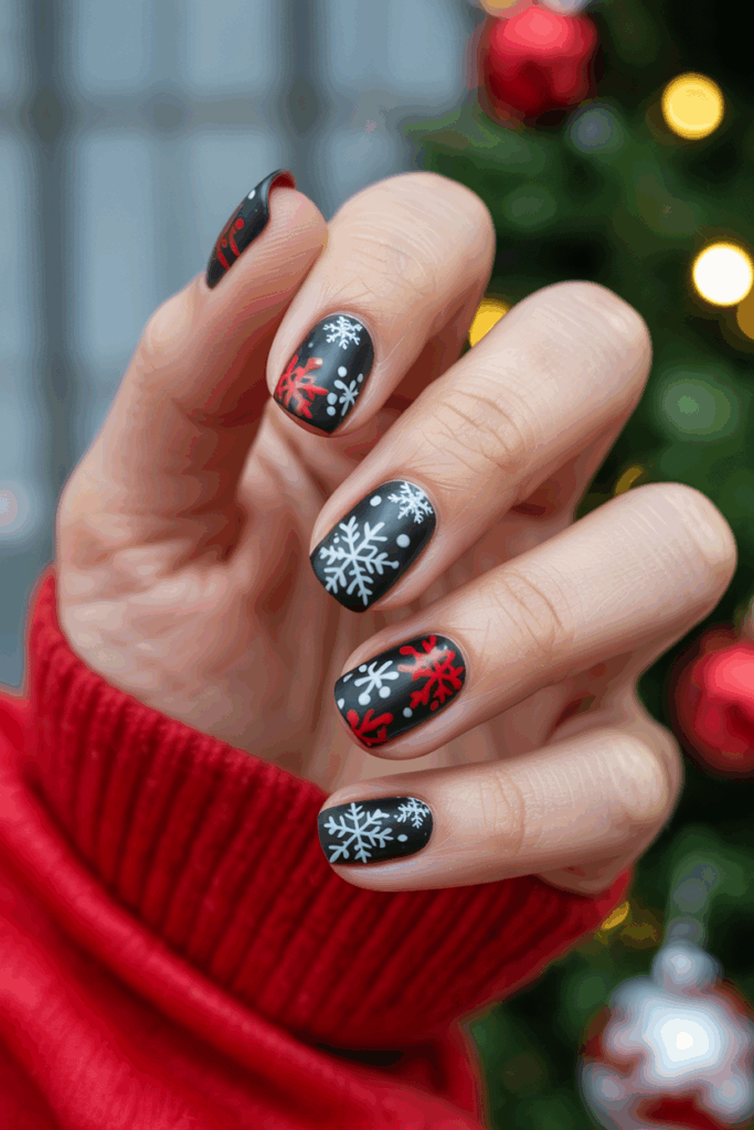This design pairs deep black and bright red for a strong holiday look. White or silver snowflakes stand out sharply against the dark colors. It fits well for those who want a modern yet festive nail style. The contrast creates a simple but powerful effect.