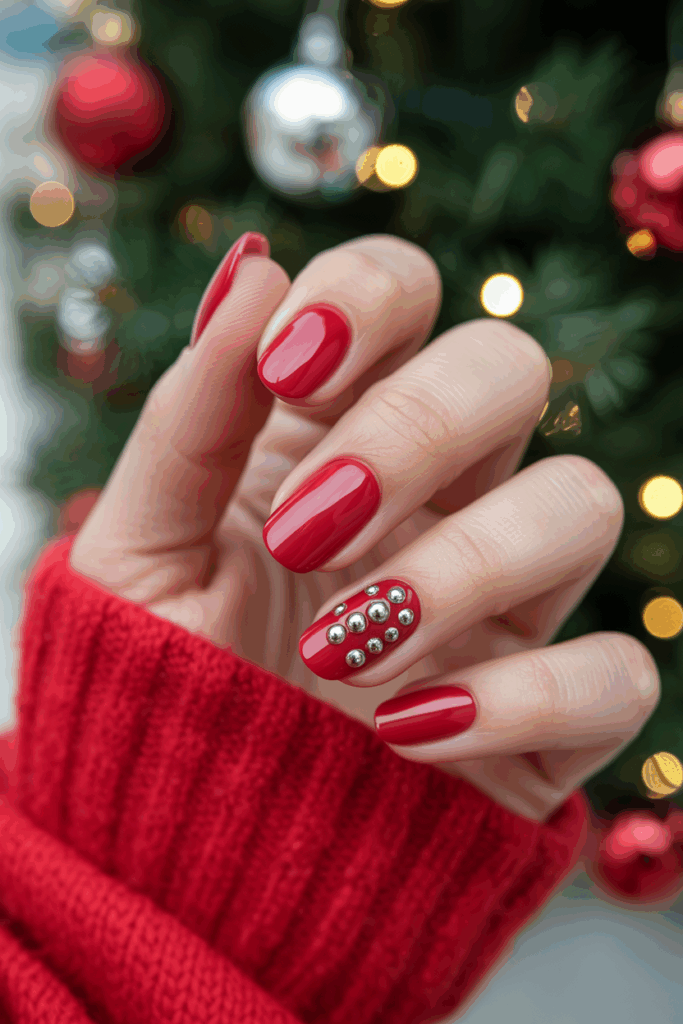 This design pairs shiny red polish with small silver studs for a clean, festive look. The glossy finish adds a classic touch.