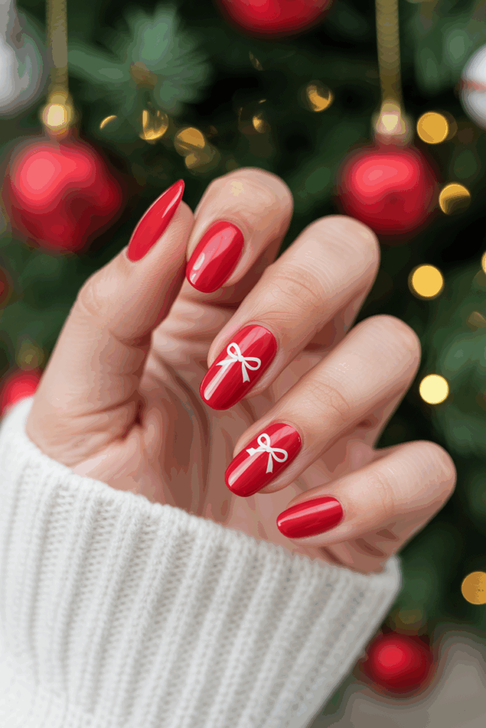 This design features a shiny red base with small bow details on one or two nails. The bows add a subtle, festive touch without being too bold. It works well for both casual and dressy holiday events. The look is simple but polished.