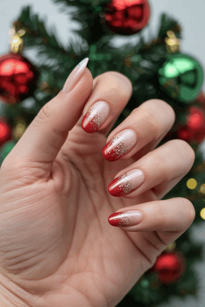 Glitter ombre nails blend sparkling glitter with smooth color fades. This style adds a festive shine without being too bold. It works well with red, gold, or silver tones for a holiday look. The subtle sparkle fits both casual and party settings.