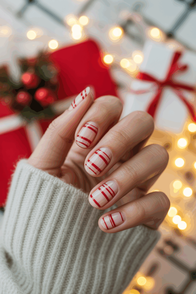 The red stripes add a classic Christmas touch without being too bold. It works well on short or long nails.
