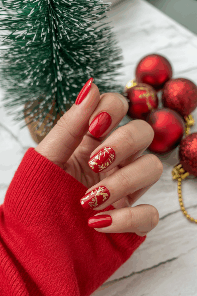 Red nails with gold foil create a simple but elegant look. The gold foil adds shine and texture without being too flashy. This design works well for both short and long nails, offering a festive touch suitable for holiday celebrations.